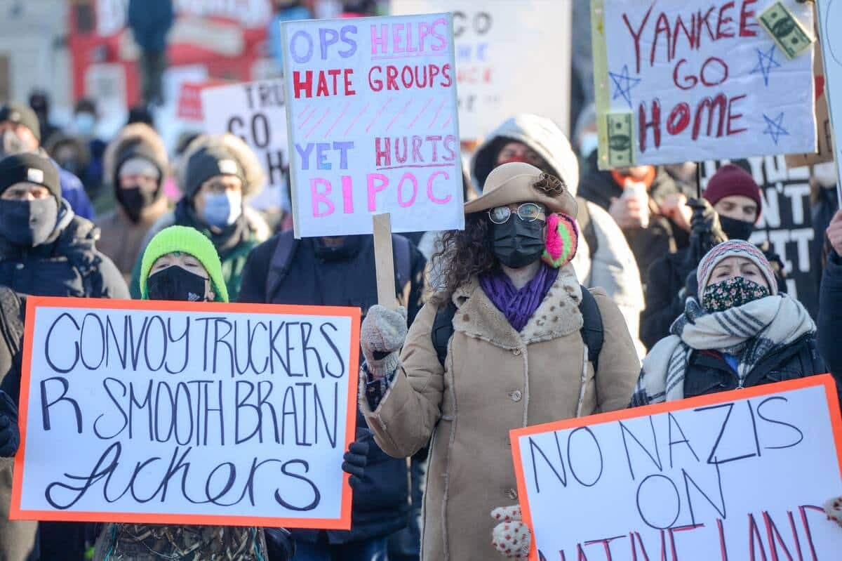 16h02 | Plusieurs dizaines de personnes se sont réunis samedi après-midi devant l’Hôtel de Ville d’Ottawa pour manifester contre le mouvement de protestation qui durent depuis maintenant une semaine aux alentours du Parlement du Canada.