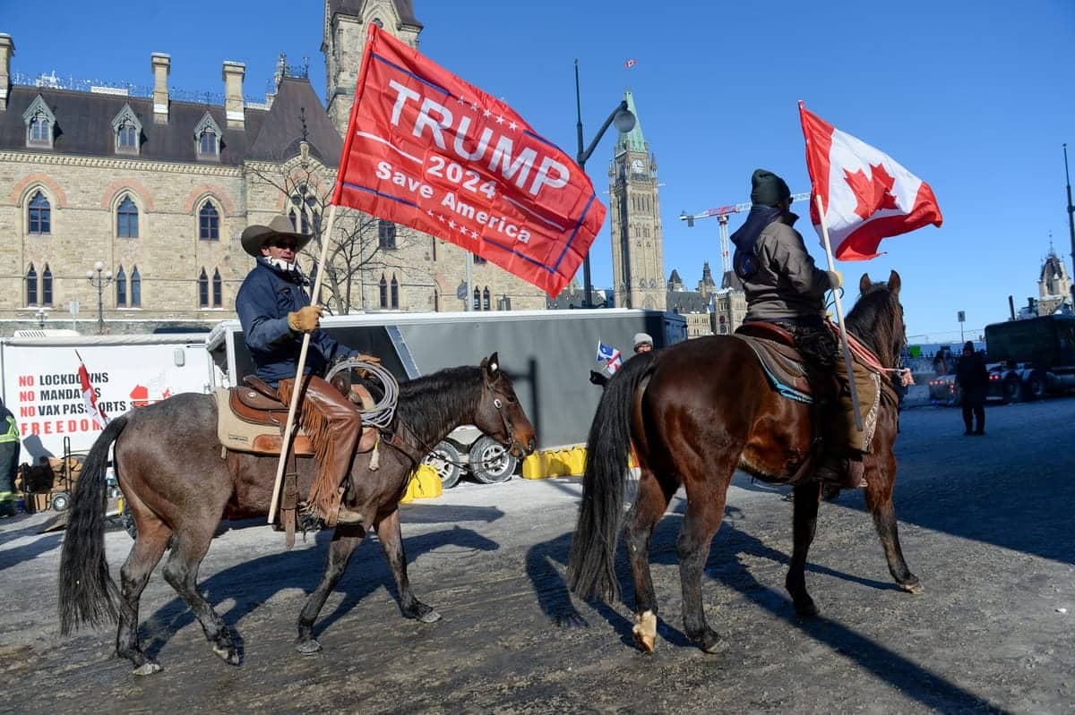 11h15. Des manifestants à chevaux, dont un avec un drapeau de Trump, viennent de débarquer.