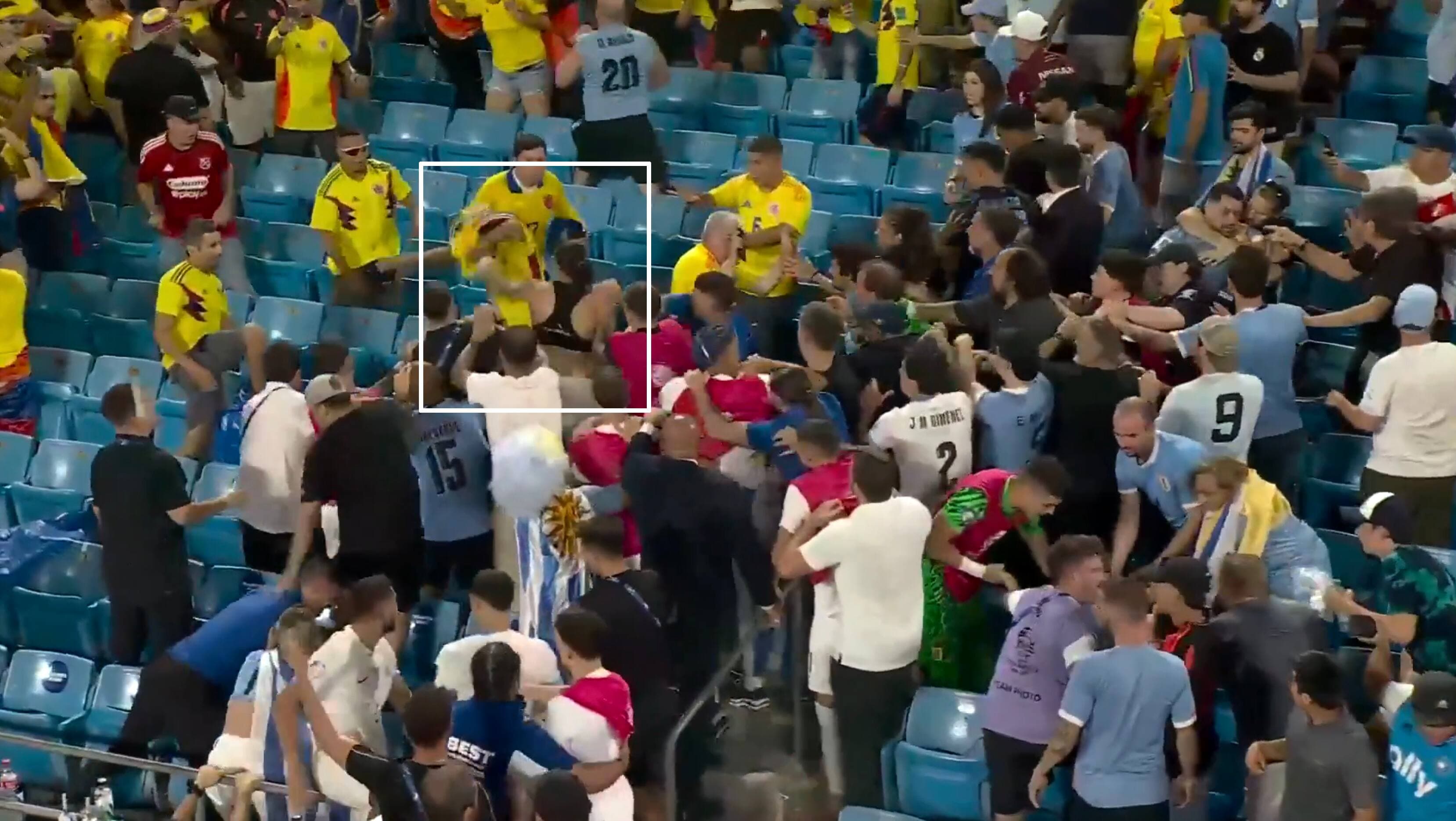 Sur les images vidéo diffusées sur X, on voit le buteur de la Celeste presque torse nu en train d'échanger des coups dans une tribune avec des supporters colombiens, dont l'un d'entre eux lui assène un puissant direct au visage.