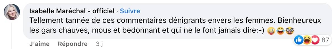 «Tellement tannée de ces commentaires dénigrants envers les femmes, a ajouté l’animatrice Isabelle Maréchal. Bienheureux les gars chauves, mous et bedonnants qui ne [se] le font jamais dire.»