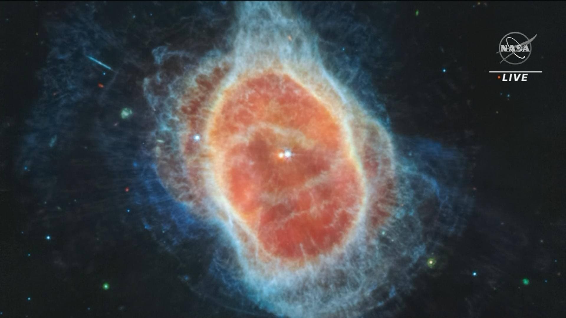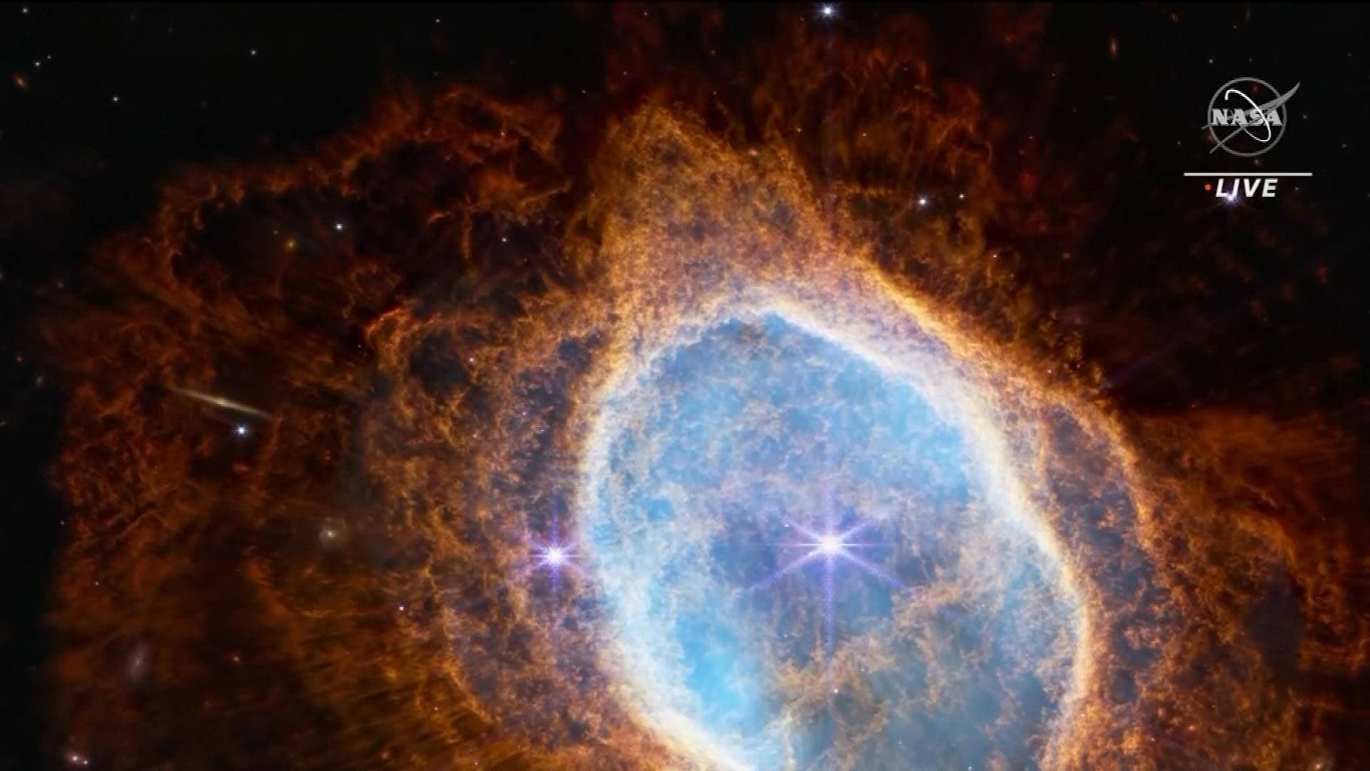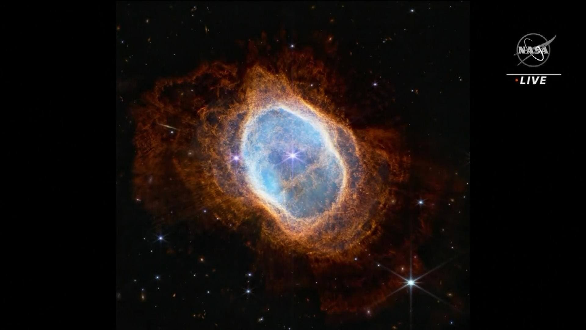 Lors d'un direct d'une heure, les quatre nouvelles observations ont été dévoilées une à une: de magnifiques images de nébuleuses illustrant le cycle de vie des étoiles, l'analyse de l'atmosphère d'une exoplanète, et le cliché d'un groupement compact de galaxies en collision.