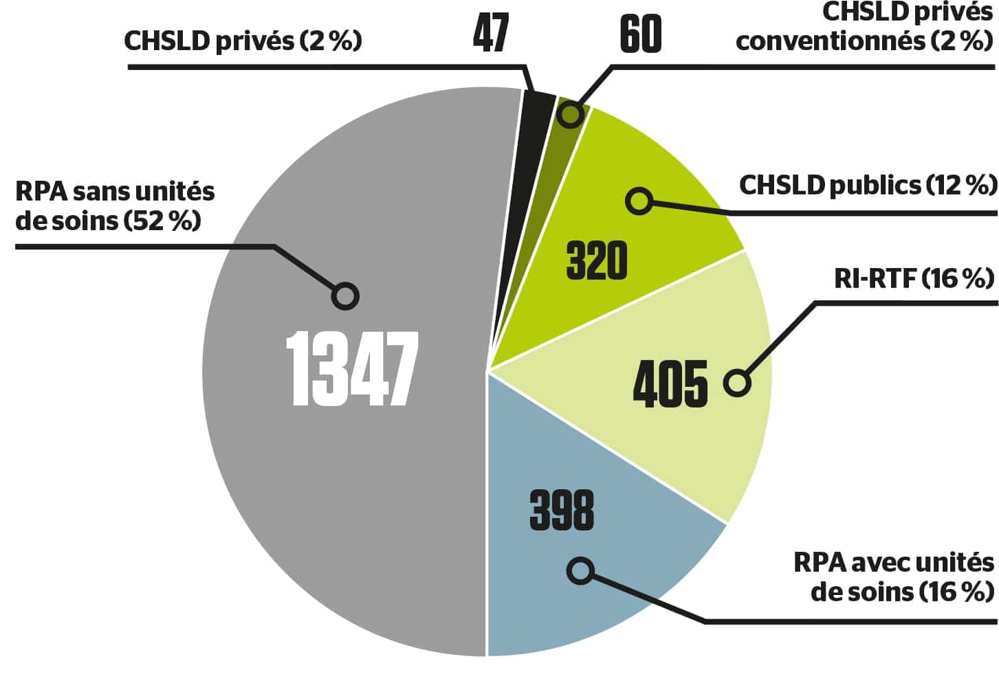 - Les RPA constituent le milieu le plus important en nombre d’organisations avec 1745 milieux (68 %), dont près du quart offre des unités de soins.