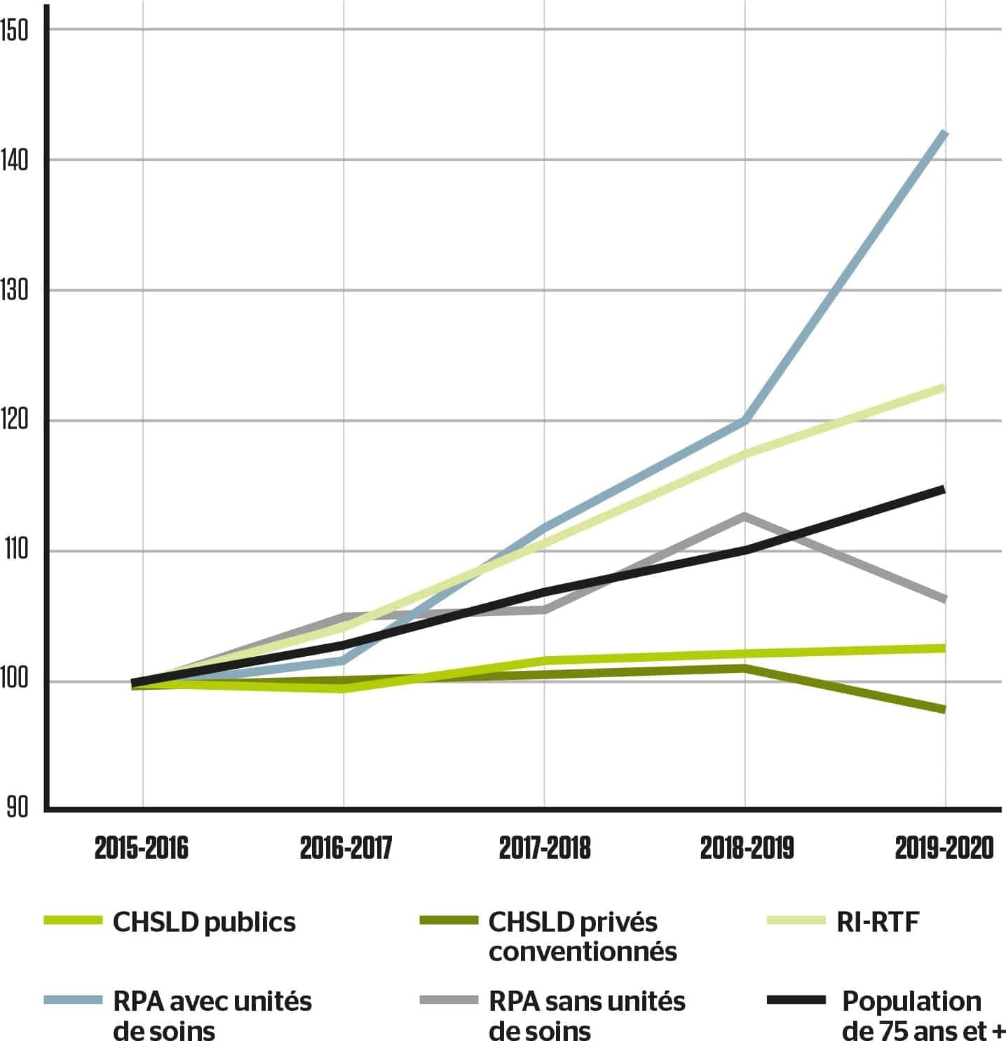 Sources : Extraction des données du MSSS, Répartition des capacités et des services autorisés au permis par installation, Système d’information sur les ressources intermédiaires et de type familial (SIRTF) et Registre des résidences privées pour aînés.