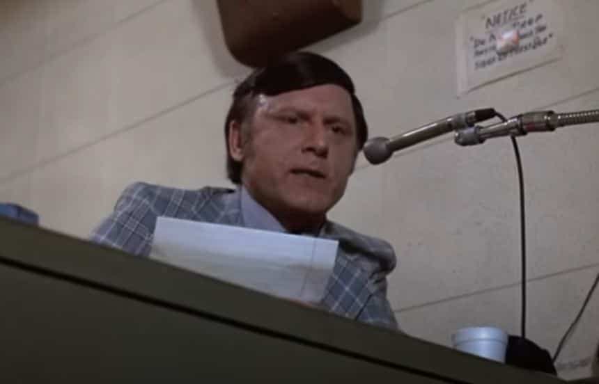 On peut ainsi le voir en train de commenter les pitreries des Chiefs de Charlestown sur la patinoire.