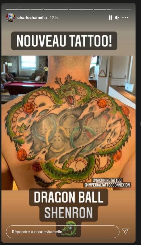 Il a d'abord fait un petit jeu avec ses abonnés en leur demandant ce qu'ils croyaient qu'il se faisait tatouer. Par la suite, il a dévoilé le résultat final : une immense pièce représentant Shenron, un personnage de dragon dans le manga Dragon Ball. Au centre, on peut également voir les anneaux olympiques sur un fond métallique.