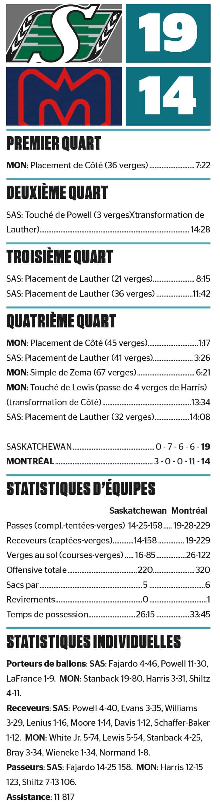 Malgré une remontée en fin de match, les hommes de Khari Jones se sont inclinés par la marque de 19 à 14 devant les Roughriders de la Saskatchewan.