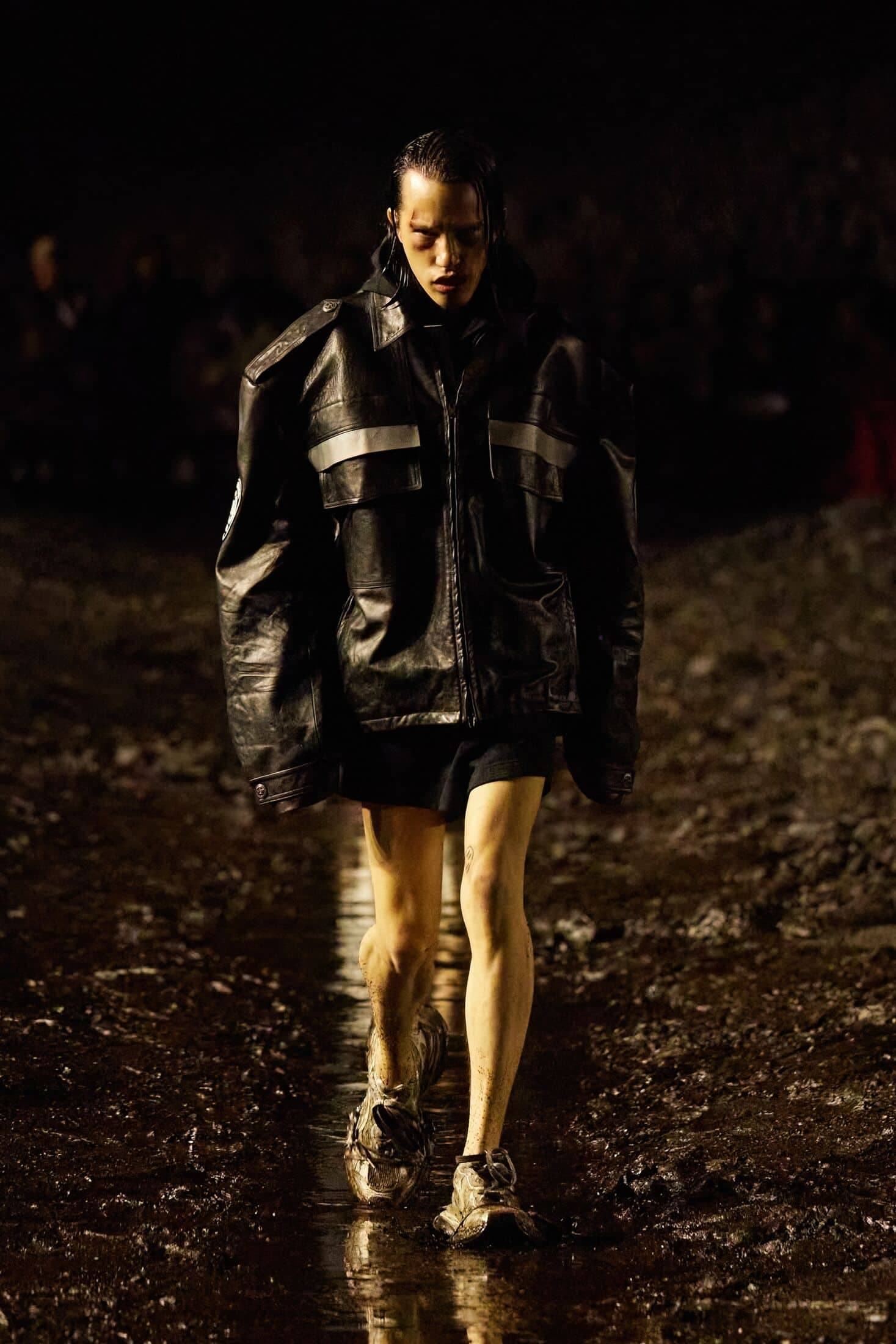 Les mannequins hommes en étaient les vedettes: tantôt en shorts et bombers noirs, tantôt en ensemble vert fluo composé de short et pull à capuche entre sportswear et tenues d'intérieur. Un jean blanc était taché de boue.