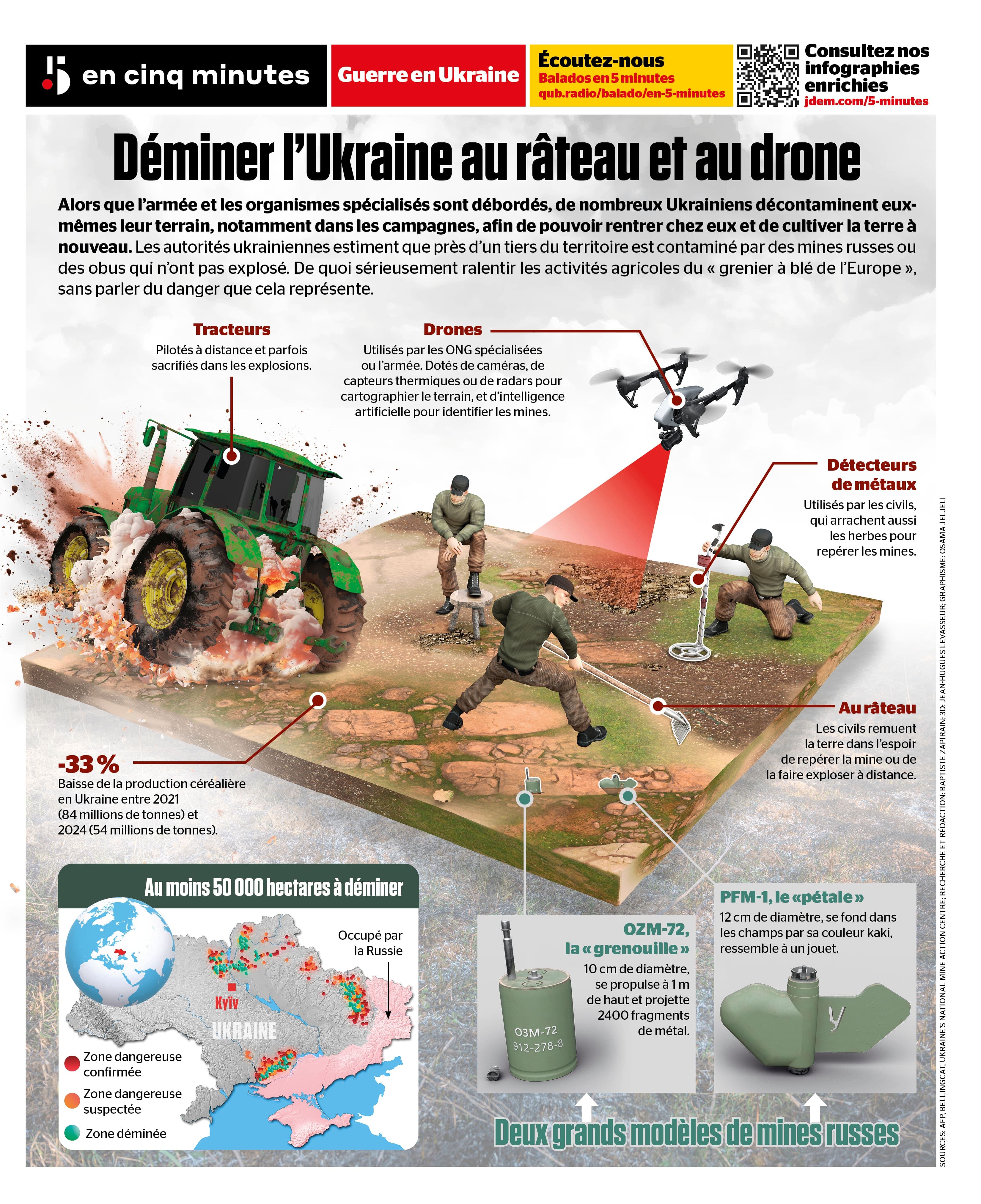 Les autorités ukrainiennes estiment que près d’un tiers du territoire est contaminé par des mines russes ou des obus qui n’ont pas explosé. De quoi sérieusement ralentir les activités agricoles du « grenier à blé de l’Europe », sans parler du danger que cela représente.