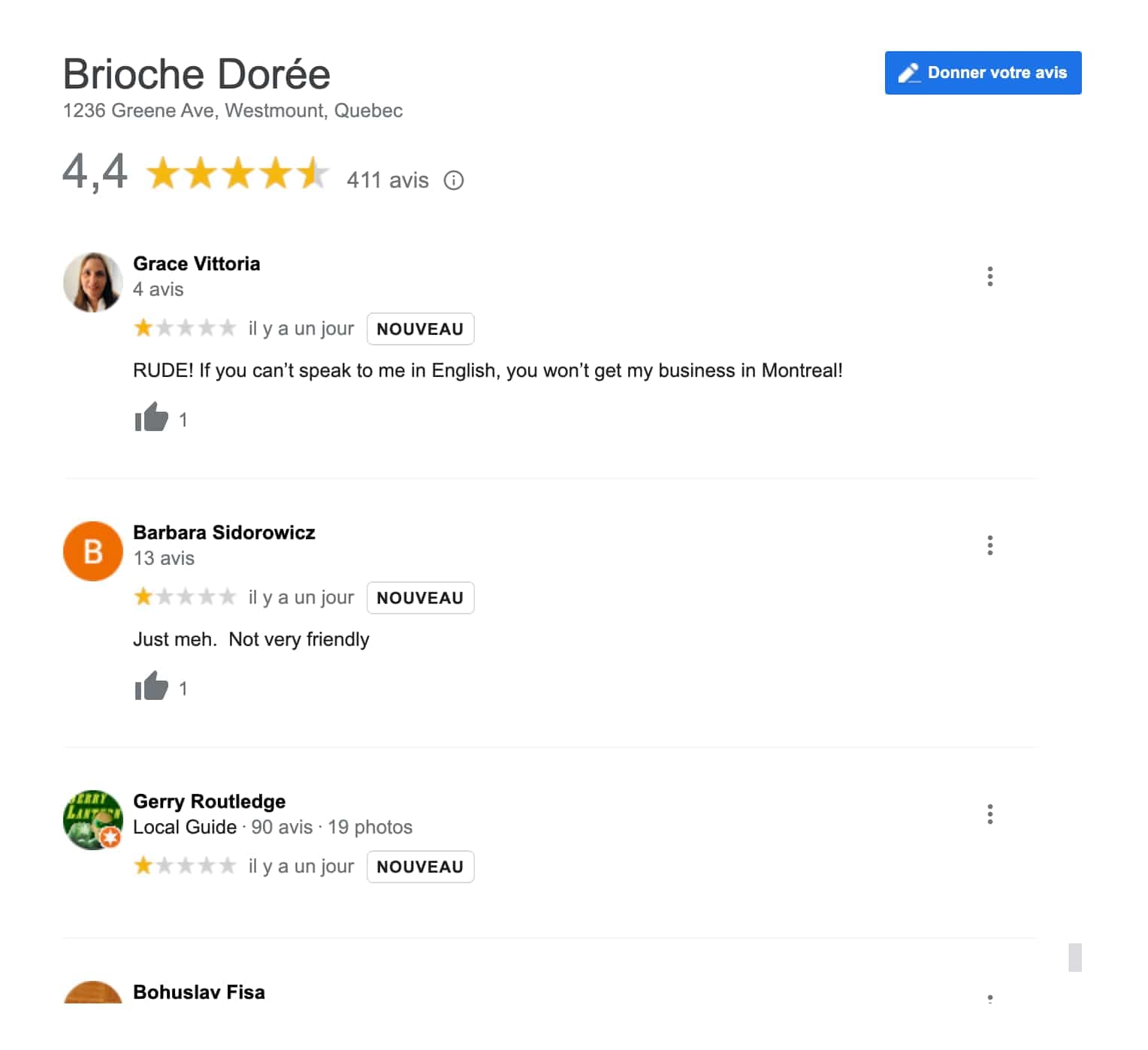 Résultat? Depuis mardi dernier, la boulangerie Brioche Dorée a reçu au moins 350 nouveaux avis sur Google. Une quarantaine d’entre eux seulement sont négatifs en raison de l’appel lancé sur les réseaux sociaux par la cliente anglophone.