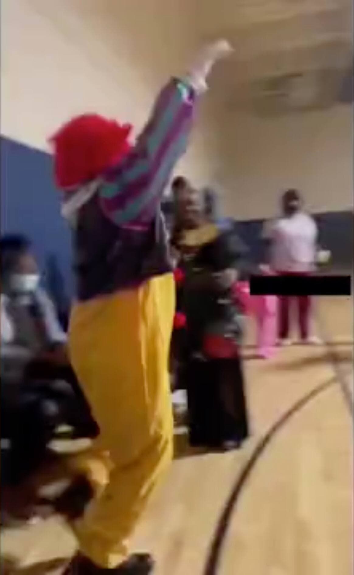 Un homme déguisé en clown se fait ramasser par des enfants dans une fête