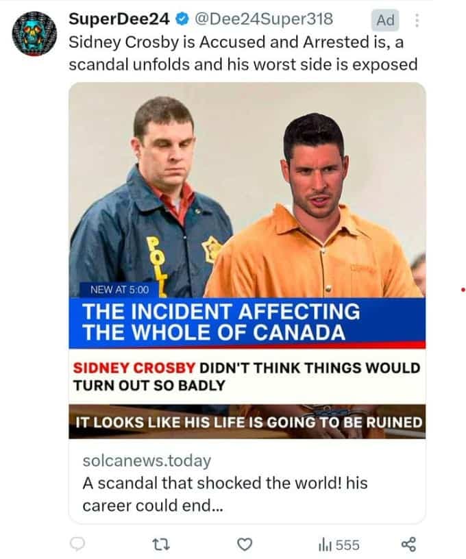 Plusieurs publications commanditées sur X (anciennement Twitter) mettent en vedette le capitaine des Penguins de Pittsburgh avec un titre scandaleux et les logos de médias crédibles.