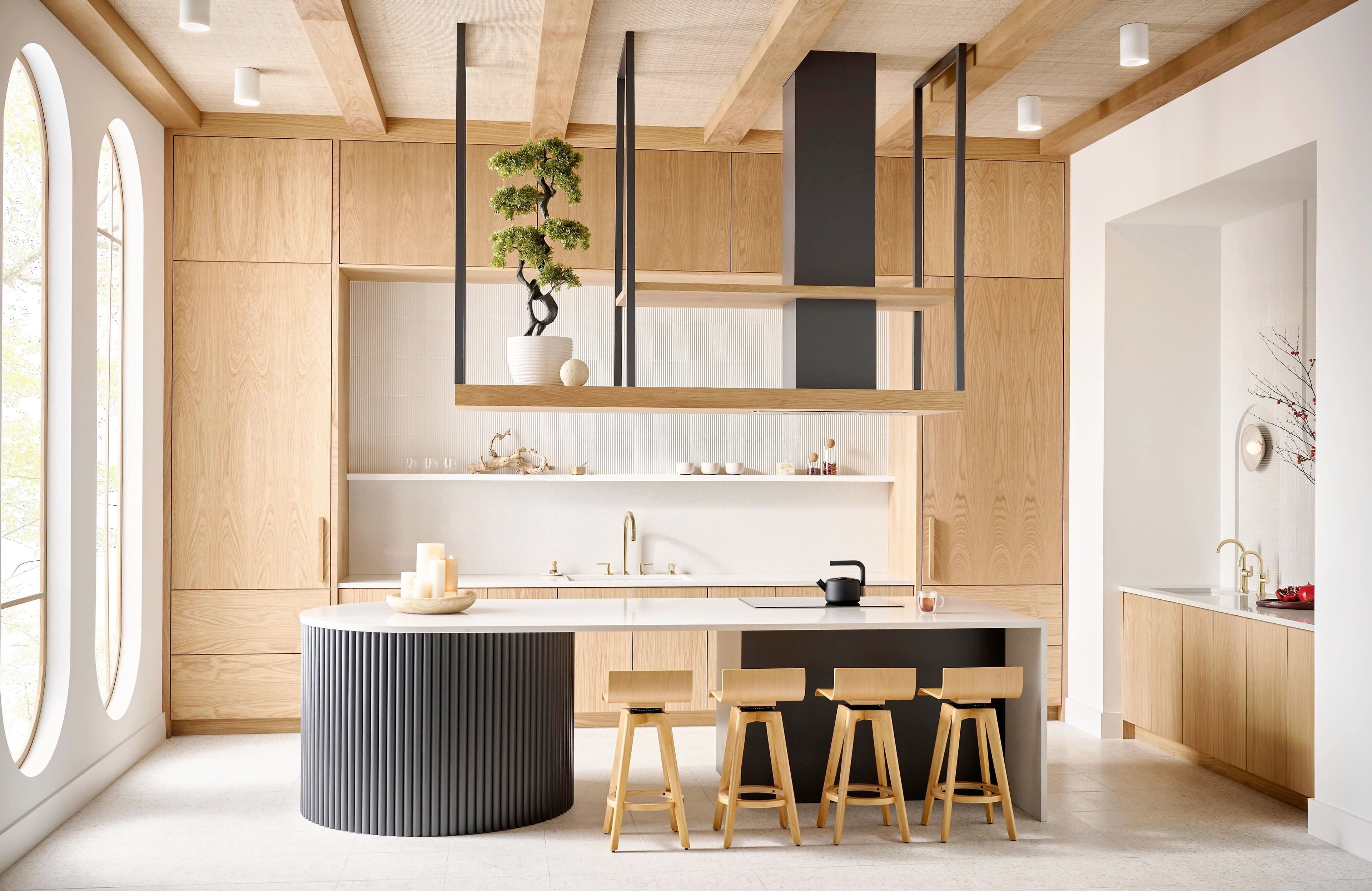 L’îlot est formé de deux sections, dont une en forme cylindrique qui attire tous les regards avec ses moulures ultrachics. On aime l’élégance et la douceur des rondeurs dans la cuisine. Autre avenue tendance: les portes en arches.