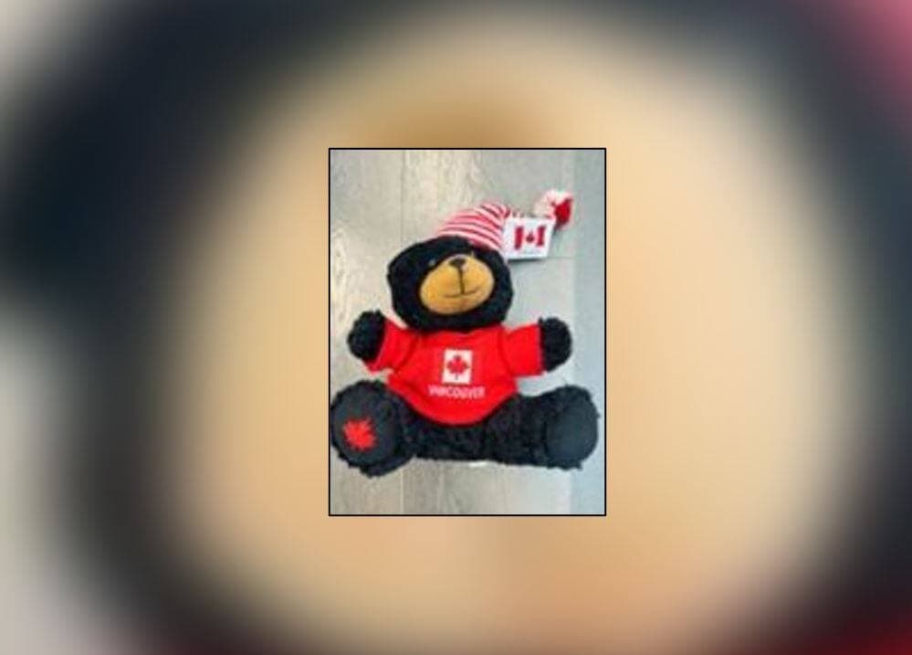 Le rappel vise 180 produits vendus à travers le Canada entre janvier et novembre 2024. Les ours en question ont le pelage noir, un chapeau rayé rouge et blanc et un chandail rouge avec une image de feuille d’érable ainsi que le mot Vancouver ou Canada.