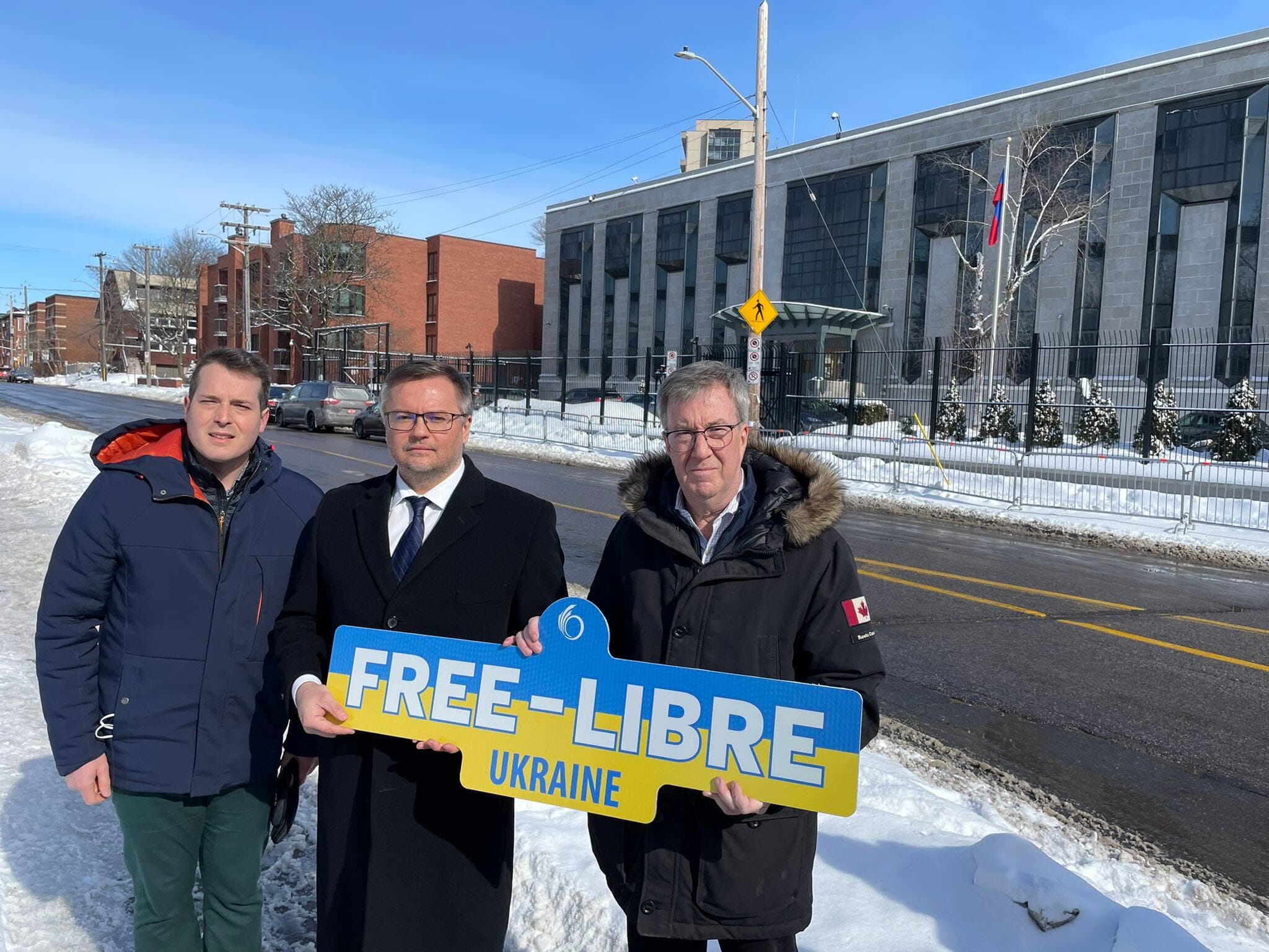 This morning, I was joined by @UKRinCAN Chargé D’Affaires, Andrii Bukvych, and @MathieuFleury to unveil streets signs along Charlotte in front of the Russian Embassy to denounce their government’s actions and to stand with the people of Ukraine. #FreeUkraine pic.twitter.com/dS3HEKQeTa