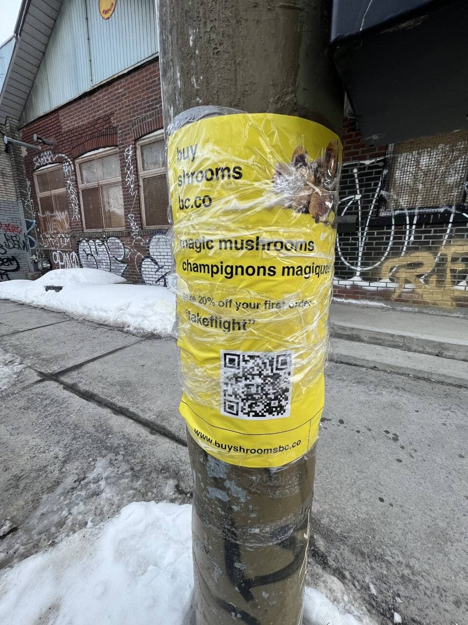 Parmi les affiches de chats perdus, de spectacles ou de services en tous genres habituellement collées sur les murs et les lampadaires de la rue Ontario, les publicités de champignons magiques détonnent.