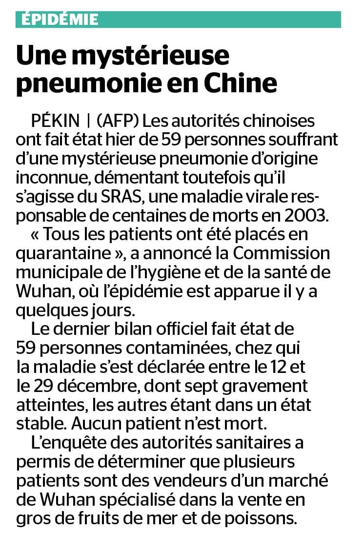 À cette date, «une mystérieuse pneumonie» commence à inquiéter la communauté scientifique et à susciter des interrogations chez elle. Au total, 59 personnes ont été contaminées, en majorité des vendeurs dans un marché de fruits de mer à Wuhan, en Chine. Tous les patients sont placés en quarantaine par les autorités sanitaires, qui affirment qu’il ne s’agit pas du SRAS, maladie virale qui avait fait des centaines de morts entre 2002 et 2003.