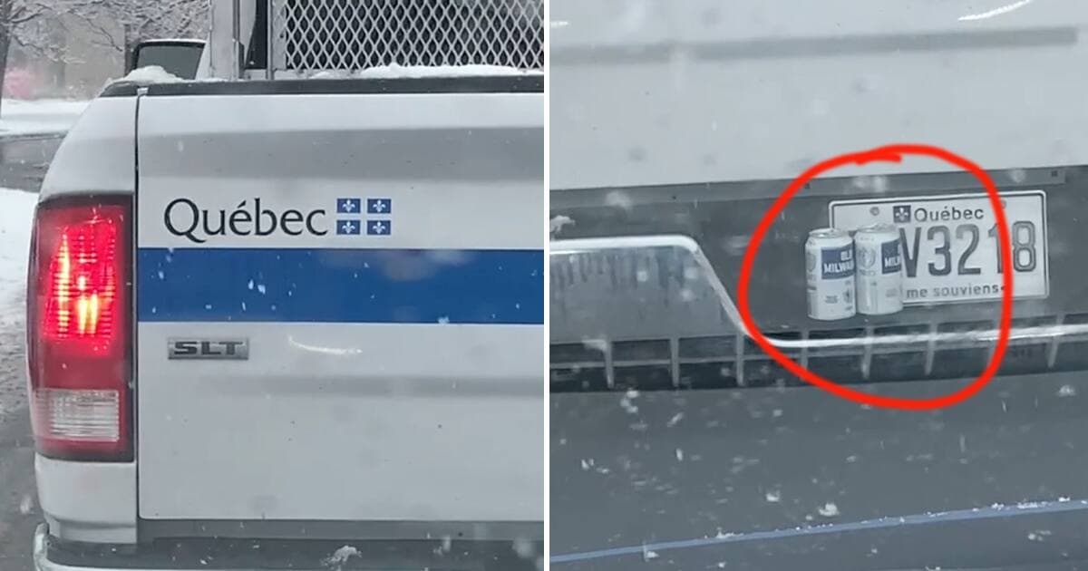Deux canettes de bières aperçues sur une camionnette du Ministère des Transports du Québec