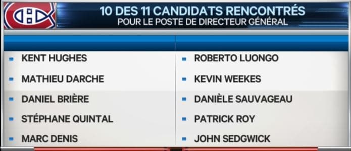 Le Canadien a confirmé que le comité de sélection avait rencontré 11 personnes. Selon ce que j’ai recevoir comme informations, voici 10 des 11 personnes qui ont été rencontrés.