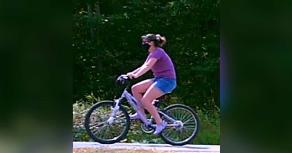 La suspecte, qui se déplace à bicyclette, porte un t-shirt aubergine, des shorts en denim et des Crocs couleur lavande.