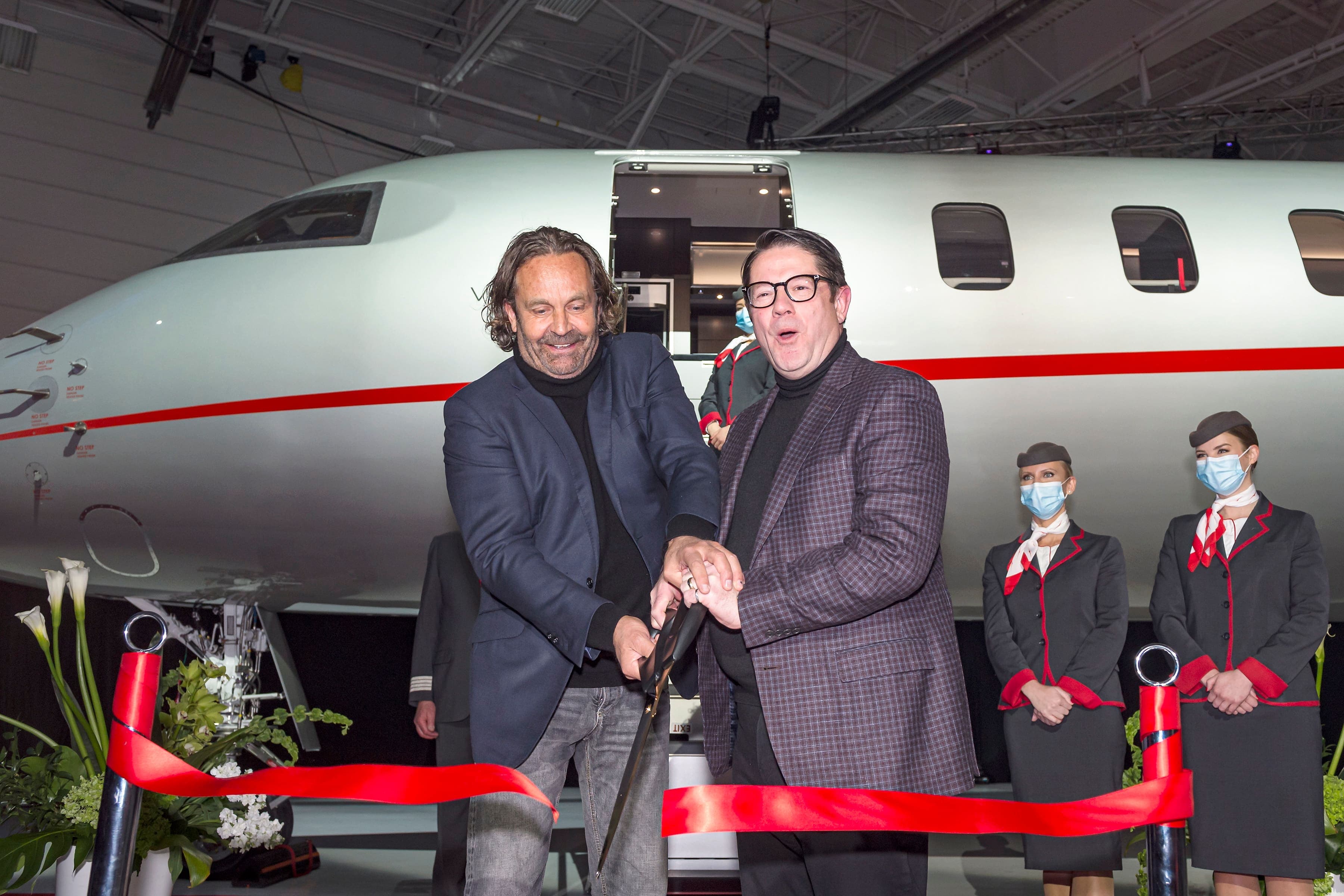 Pour l’occasion, le PDG de Bombardier, Éric Martel, et le fondateur et président de VistaJet, Thomas Flohr, ont fait leur entrée dans la salle en foulant un tapis rouge, sous les acclamations des employés.