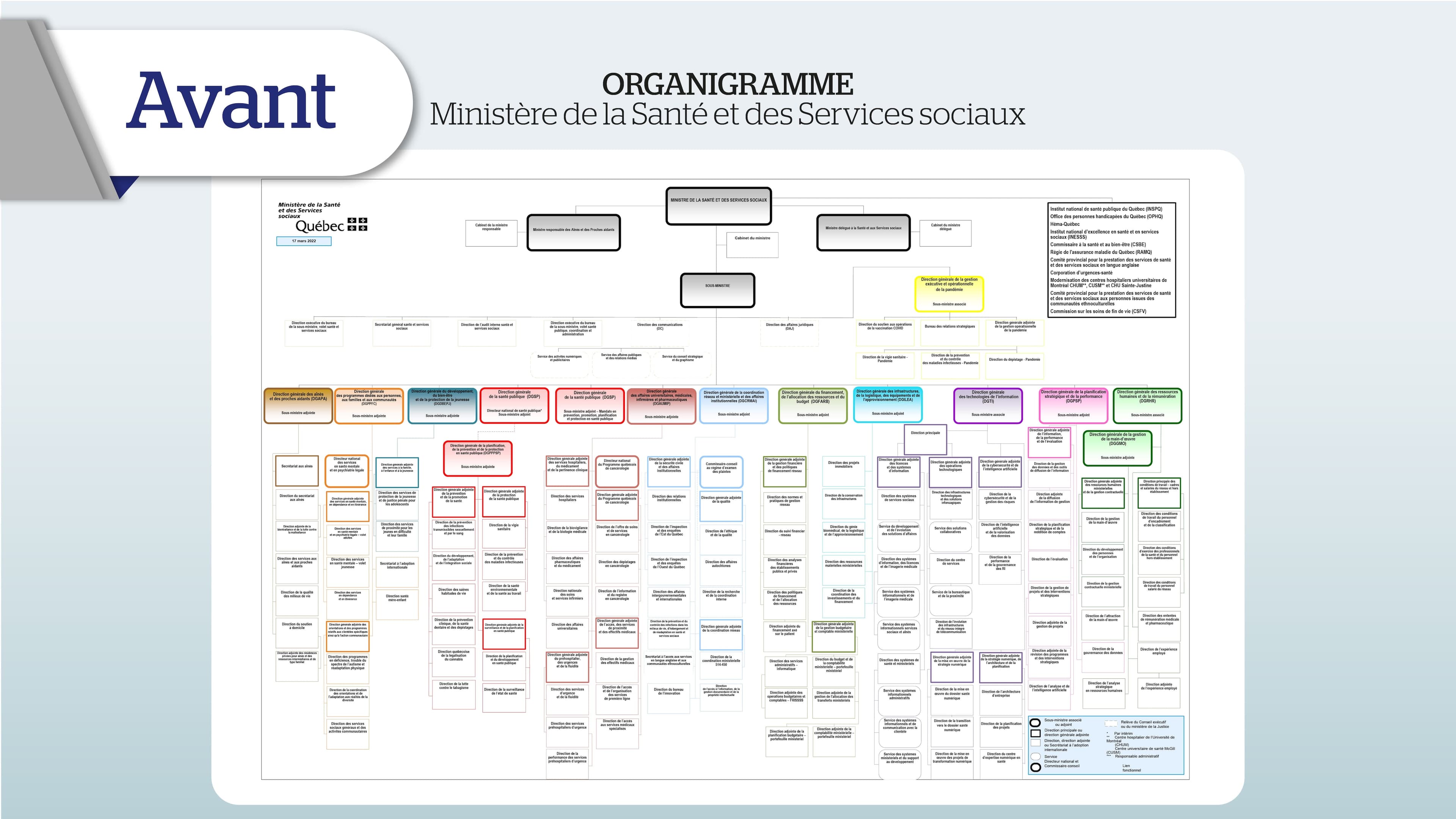 Pour illustrer son propos, le ministre rappelle sa volonté de réduire les listes d’attente en chirurgie. « C’est du quotidien, ça ; c’est tous les jours qu’il faut regarder et se dire : comment ça se fait que tel médecin, ça ne va pas aussi vite que les autres ? Mais ce n’est pas une sous-ministre qui a 15 sous-ministres adjoints et 34 PDG qui peut faire ça », dit-il.