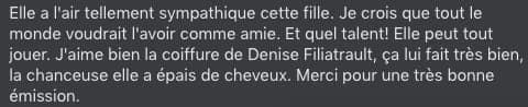 Le public a également manifesté son goût pour la transformation capillaire de Denise sur la page Facebook de Bonsoir bonsoir!. Ils étaient nombreux à souligner combien sa crinière lui allait à merveille!