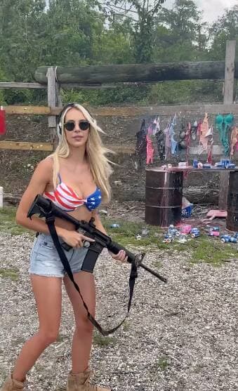 «Sois woke et fais faillite», dit-elle, avant d’appuyer sur la gâchette de son fusil AR-15.