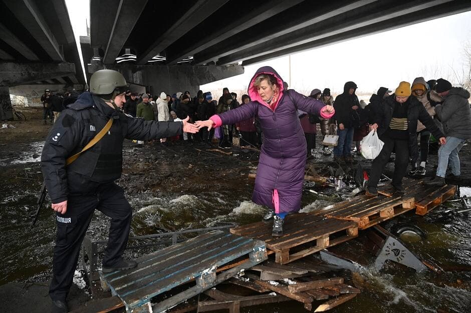 Lentement et sous la neige, ils passent la rivière et entrent dans Kyïv à pied, en fauteuil, en brouette... Mardi, même les plus anciens ont fui Irpin, poussés par leurs enfants, la faim, le froid, les combats ou la peur des chars russes qui s'approchent.