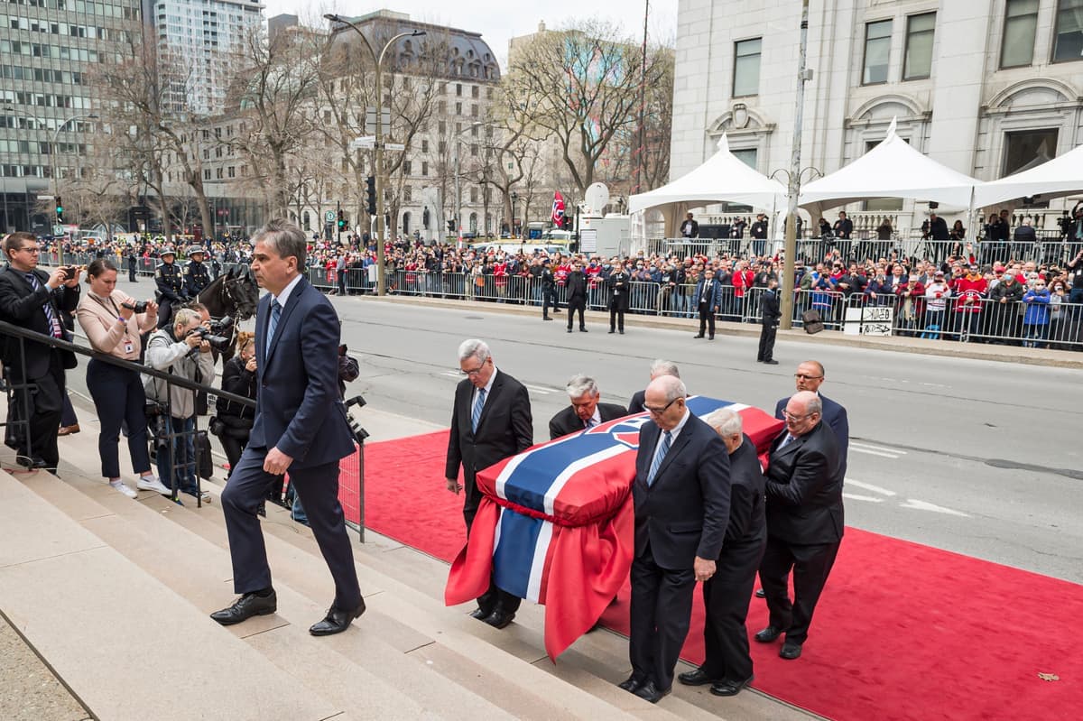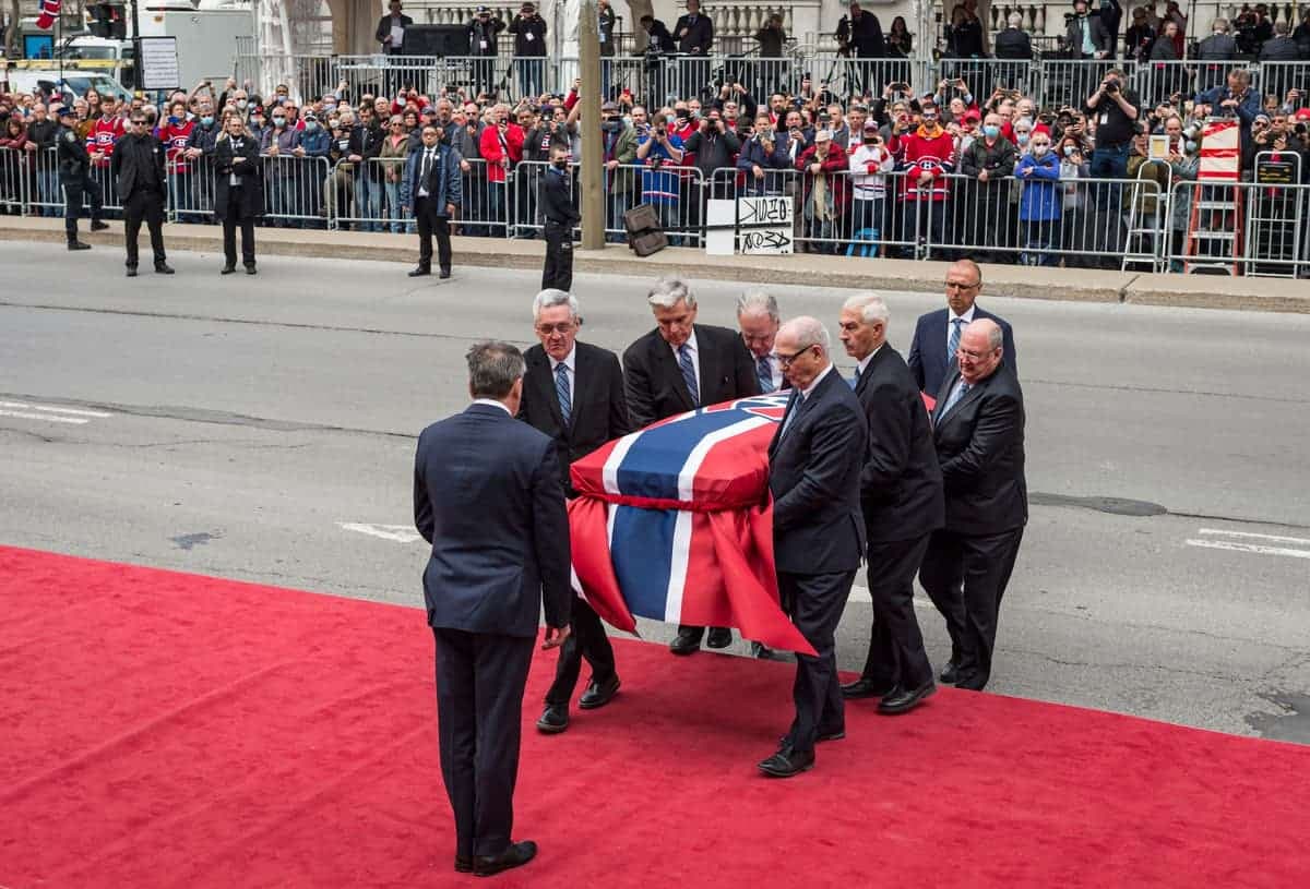 Le cercueil drapé aux couleurs du Canadien de Montréal et transporté par quelques anciens coéquipiers du Démon blond a fait son entrée sous les yeux de nombreux dignitaires et d’une centaine de personnes provenant du grand public.