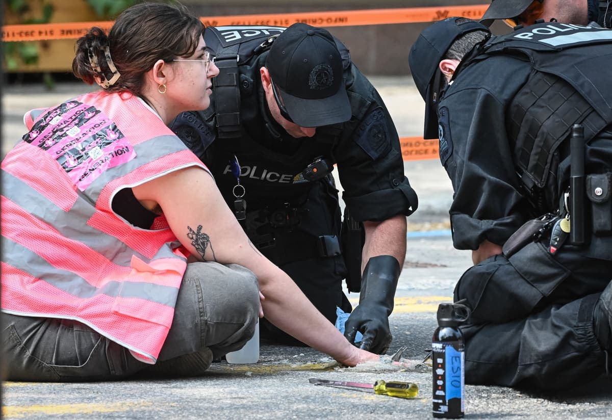 À quelques centaines de mètres de son véhicule, en pleine rue Saint-Denis, près de l’intersection de l’avenue Mont-Royal, deux militants du groupe Last Generation Canada se sont collé la main au sol à l’aide d’une colle cyanoacrylate, bloquant ainsi les voies de circulation en direction nord et sud.