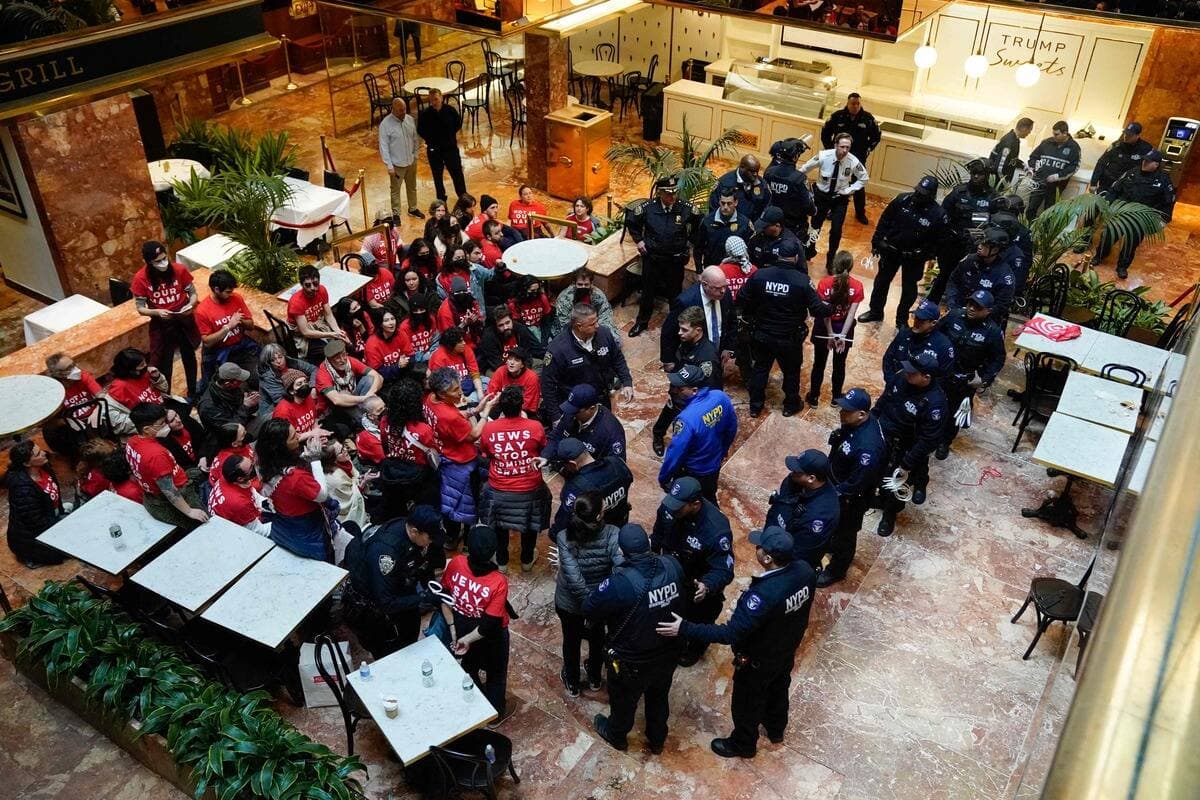 Vêtues de T-shirt rouges aux inscriptions blanches, en référence au mouvement «Make America Great Again» de Donald Trump, ces personnes ayant répondu à l'appel de l'organisation américaine Jewish Voice for Peace (La voix juive pour la paix) ont investi en fin de matinée le gratte-ciel ultra-sécurisé de Manhattan, antre new-yorkais du président des États-Unis, dont ils dénoncent le tour de vis contre la liberté d'expression.