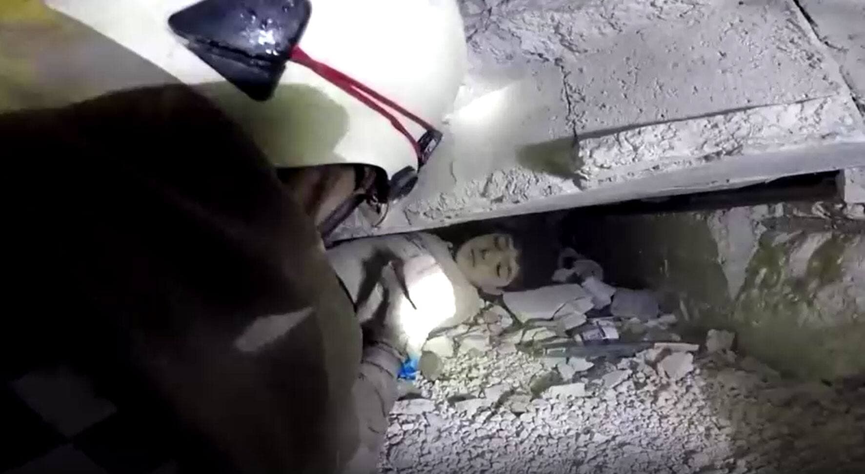 En Syrie, les Casques blancs ont réussi à extraire un garçon coincé dans les décombres de sa maison, où il était coincé depuis le séisme tragique à Jandairis.