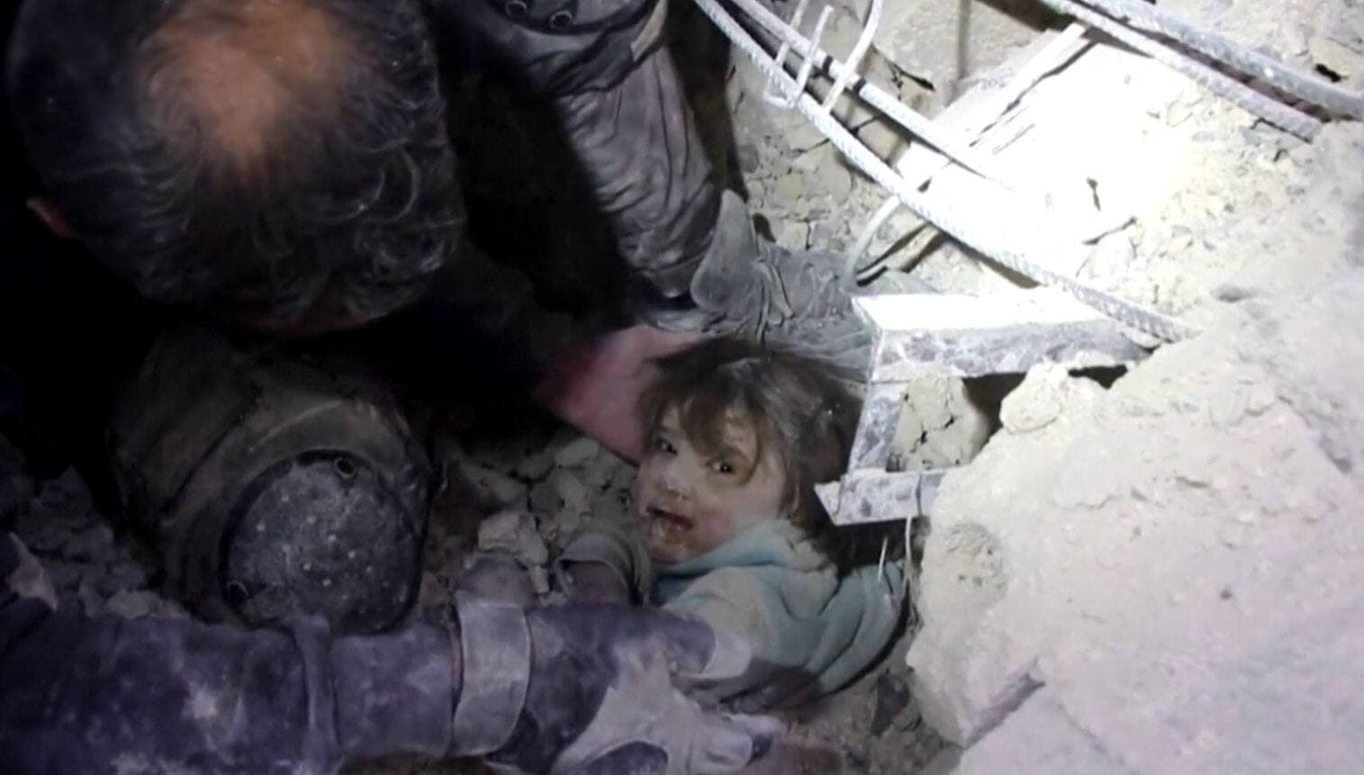 «Allez Haroon, allez», ont crié les secouristes, des Casques blancs, en tirant doucement sur le garçon pour l’extraire du tas de béton, montrent les images de Reuters.