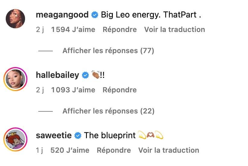 Sans surprise, le cliché a fait sensation sur le réseau social et plusieurs amis et collègues célèbres ont pris le temps de le commenter, incluant la petite sirène Halle Bailey, l'actrice Meagan Good et la rappeuse Saweetie.