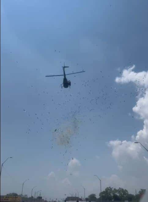 Une vidéo, tournée par Crystal Perry, la nièce de M. Thomas, semble avoir été prise depuis l'intérieur d'une voiture roulant sur l'autoroute, juste en dessous de l'hélicoptère. On y voit des rafales de billets de banque souffler vers le véhicule. Des gens se précipitent pour les ramasser au milieu de la rue.