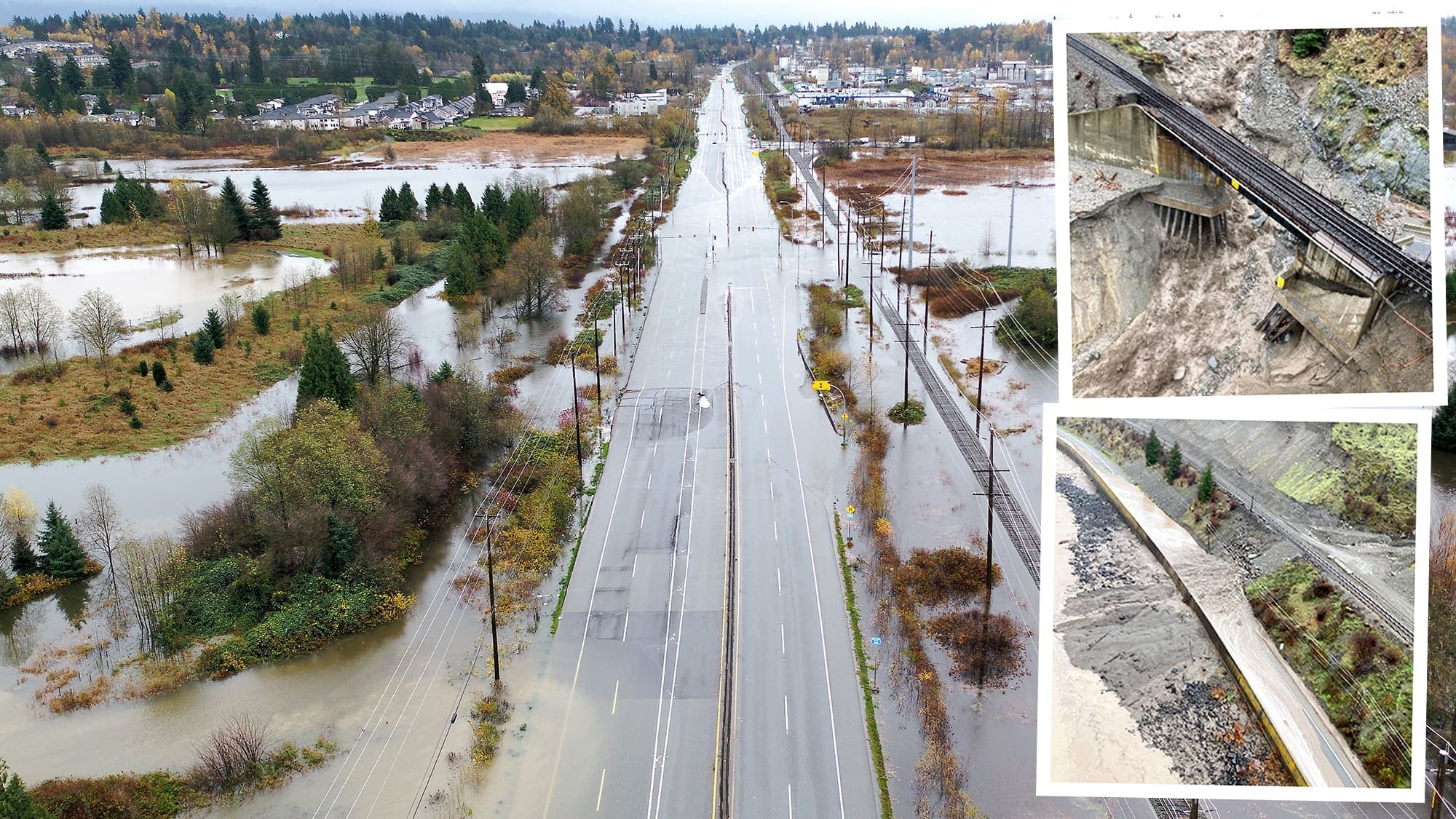 Des inondations et des glissements de terrain ont ravagé tout le réseau de transport. Les quatre autoroutes qui relient la région de Vancouver au reste de la Colombie-Britannique et du pays sont fermées (la 1 ou Transcanadienne, la 3, la 5 et la 99).