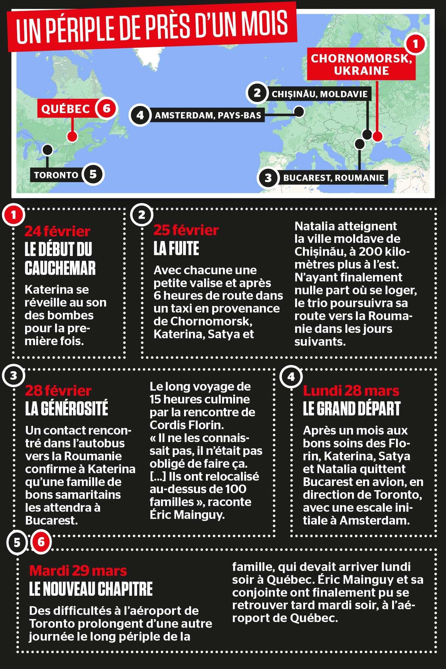 Plus d’un mois après le début des bombardements en Ukraine, Éric Mainguy et sa femme sont enfin réunis. Katerina, sa fille Satya et sa mère Natalia sont finalement arrivées au Québec tard mardi soir, heureuses de troquer la peur pour l’espoir d’une vie nouvelle.