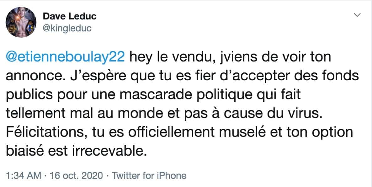 «Hey le vendu, jviens de voir ton annonce. J'espère que tu es fier d'accepter des fonds publics pour une mascarade politique qui fait tellement mal au monde et pas à cause du virus. Félicitations, tu es officiellement muselé et ton option biaisé est irrecevable.» a écrit Dave Leduc sur Twitter le 16 octobre.