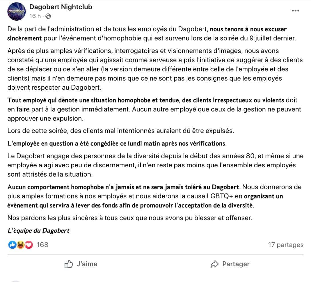 La discothèque a laissé savoir que des éléments de la formation des employés allaient être révisés et qu’elle voulait organiser un événement afin de soutenir la cause de la diversité sexuelle et de genre.