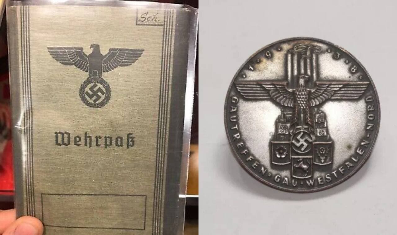 Parmi ceux-ci: des casques de combat allemands, des médailles du IIIe Reich, un porte-cigarettes, des documents d’identification de soldats nazis et de la coutellerie.