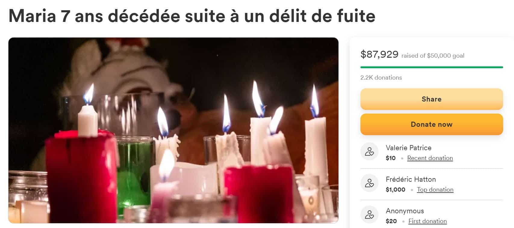 L’une des campagnes de sociofinancement créées afin d’aider la maman de la fillette tuée par un chauffard en chemin vers l’école, mardi, a permis d’amasser plus de 87 000$ en date de jeudi matin, soit moins de 23 heures après sa mise en ligne.