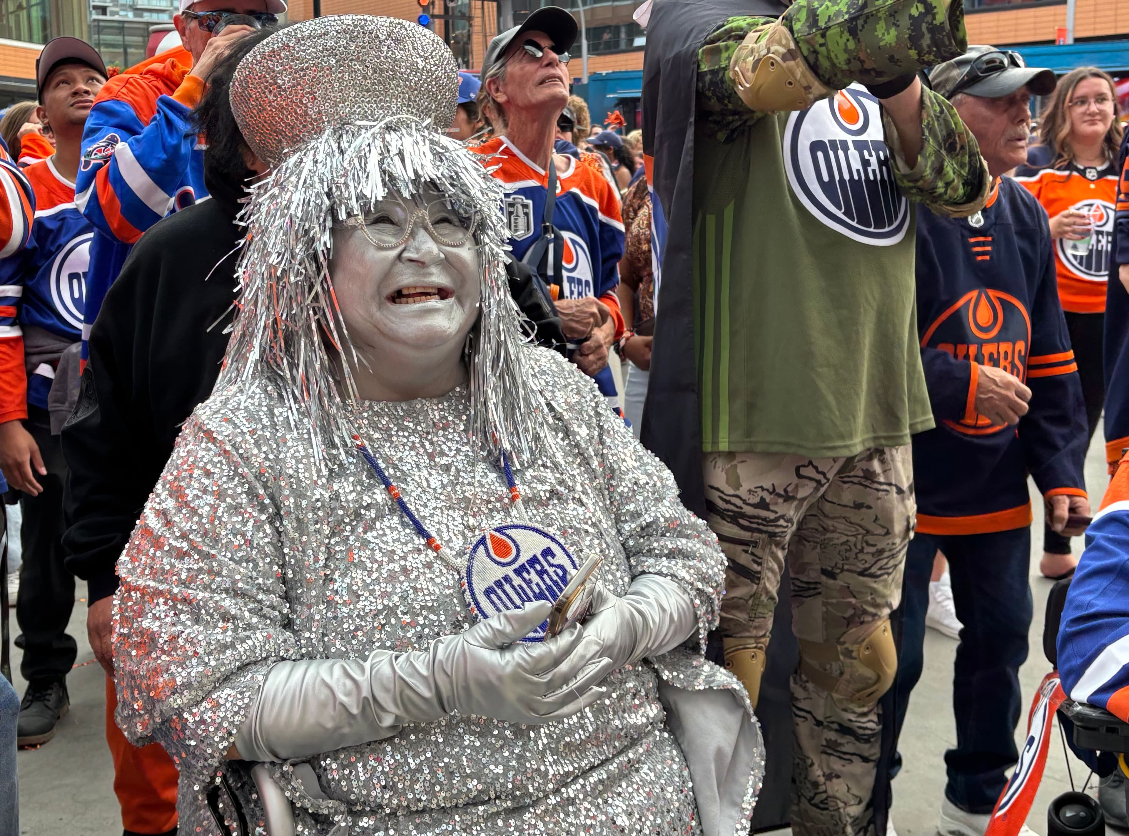 Si, quelques fois, on a pu l’apercevoir à l’intérieur de l’édifice, que ce soit dans une loge ou derrière le banc des Oilers, elle préfère s’entourer des partisans du Moss Pit.