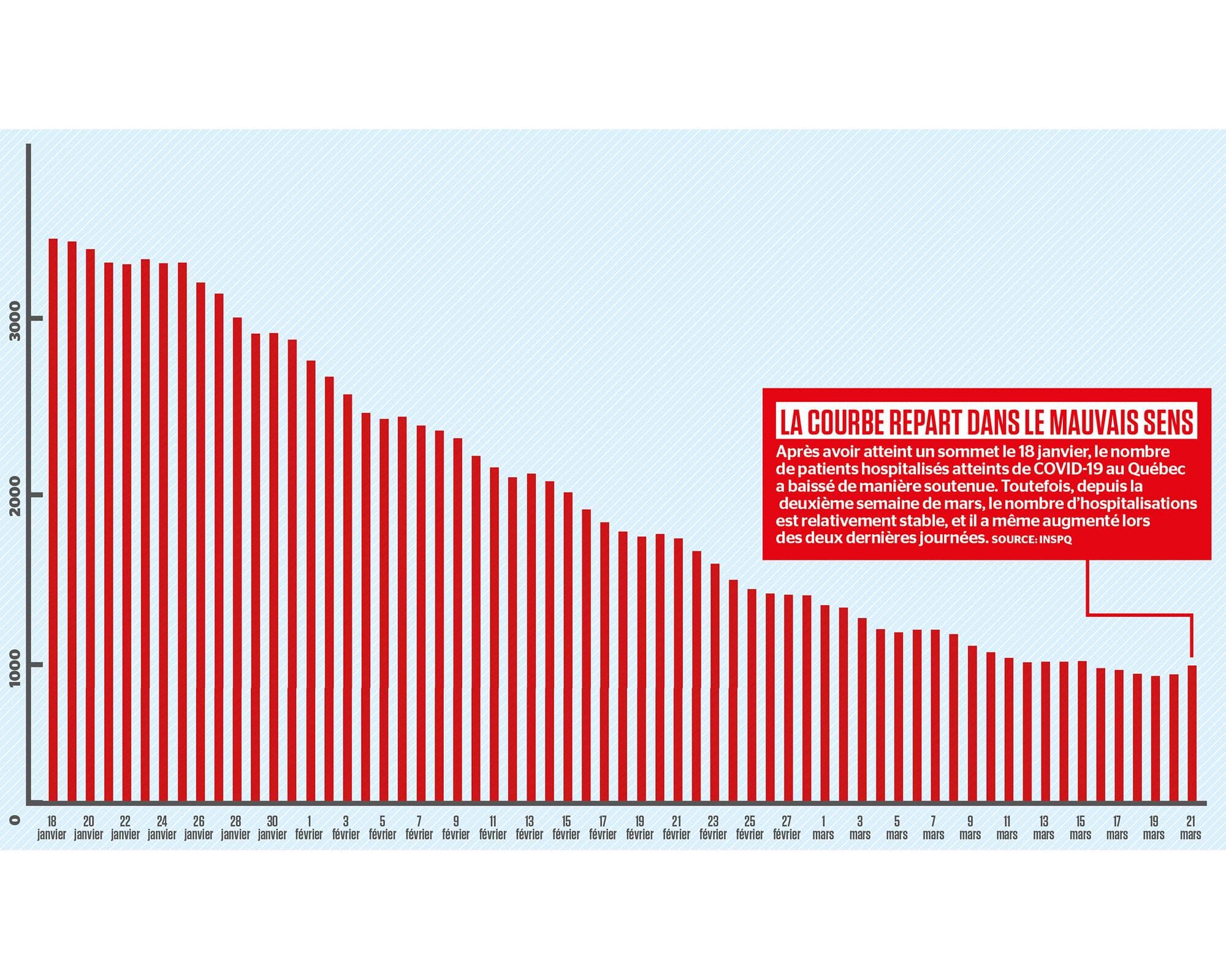 Selon des estimations, on recensait plus de 20 000 cas de coronavirus par jour au Québec vers la mi-mars