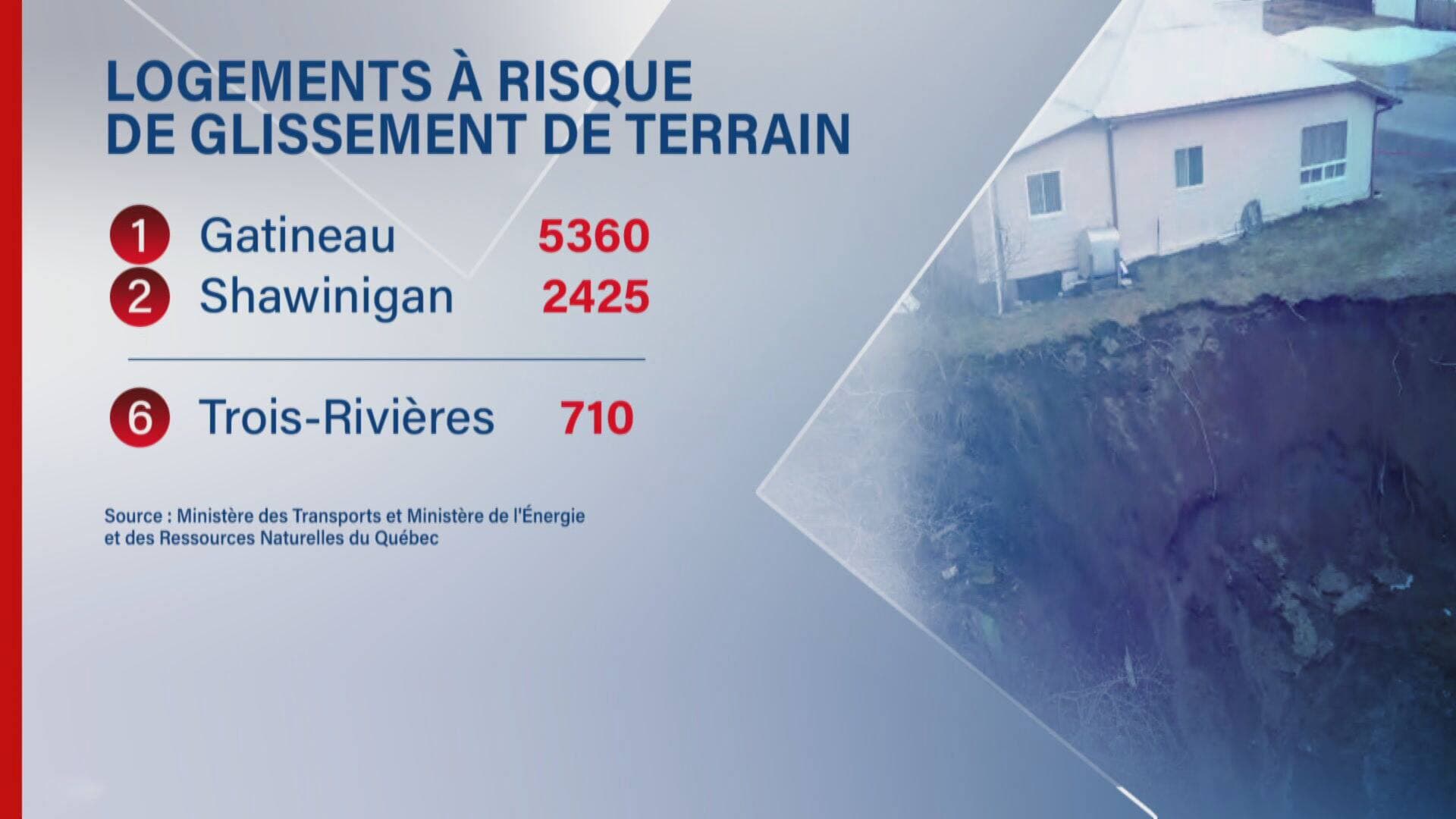 Au Québec, Shawinigan se classe au deuxième rang des villes avec le plus de logements à risque de glissements de terrain, avec un total de 2425. Trois-Rivières obtient la sixième place, avec 710 logements à risque, selon les données du ministère des Transports et du ministère de l'Énergie et des Ressources Naturelles.