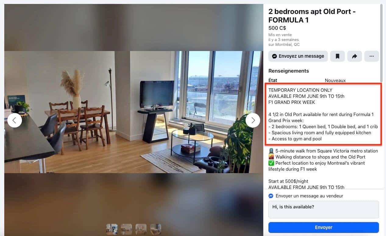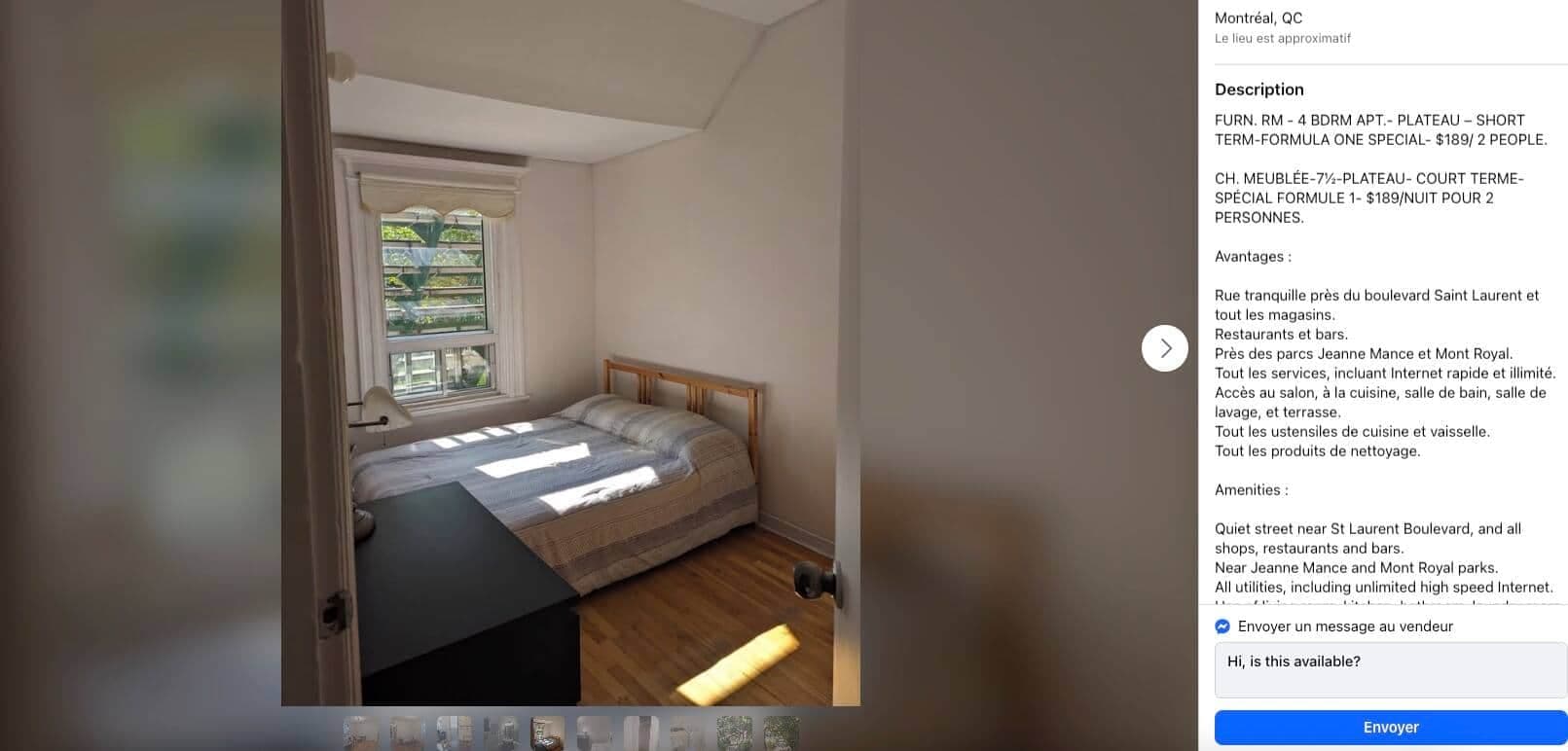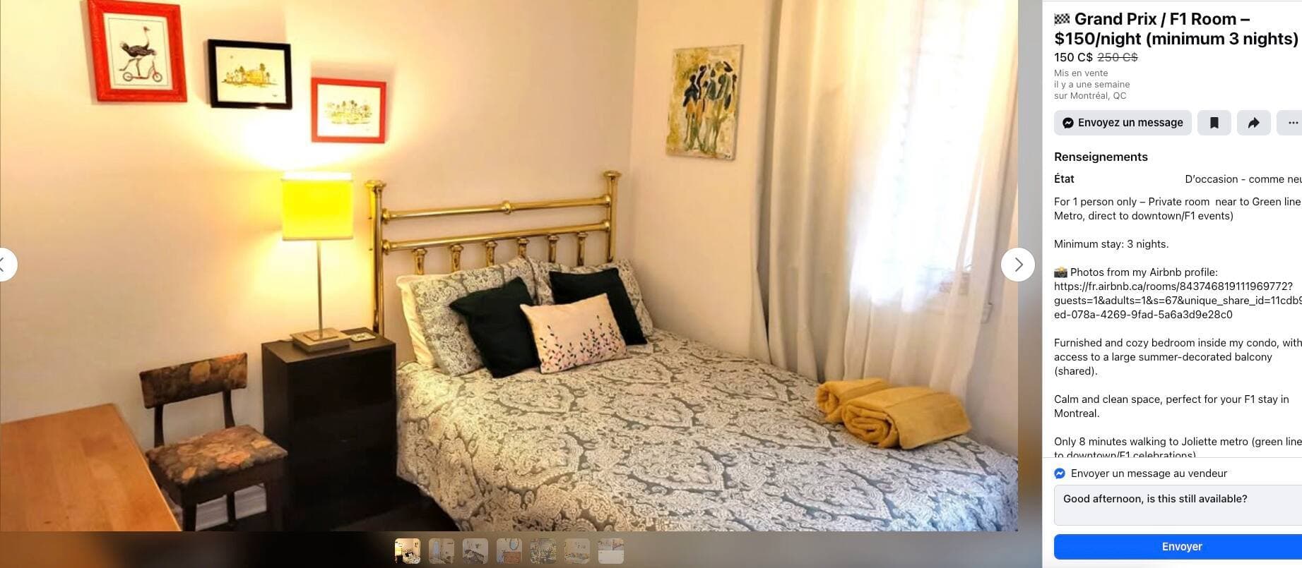 «Envie de vivre le Grand Prix dans un cadre confortable et bien situé? Mon appartement spacieux est disponible pour la fin de semaine de la F1 à Montréal», peut-on lire dans une publication sur Kijiji, où le propriétaire offre un toit dans le quartier Rosemont à 480$ la nuit.