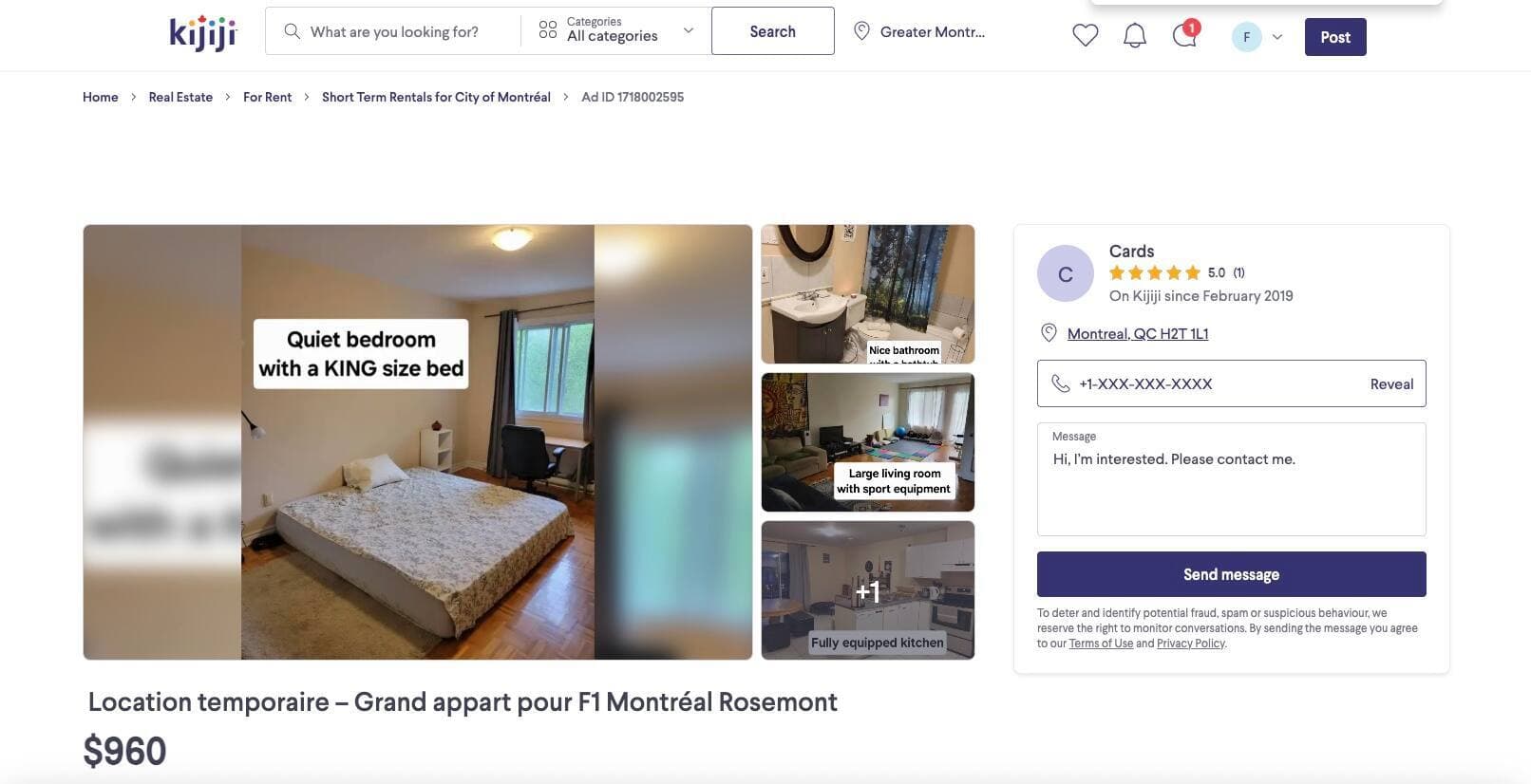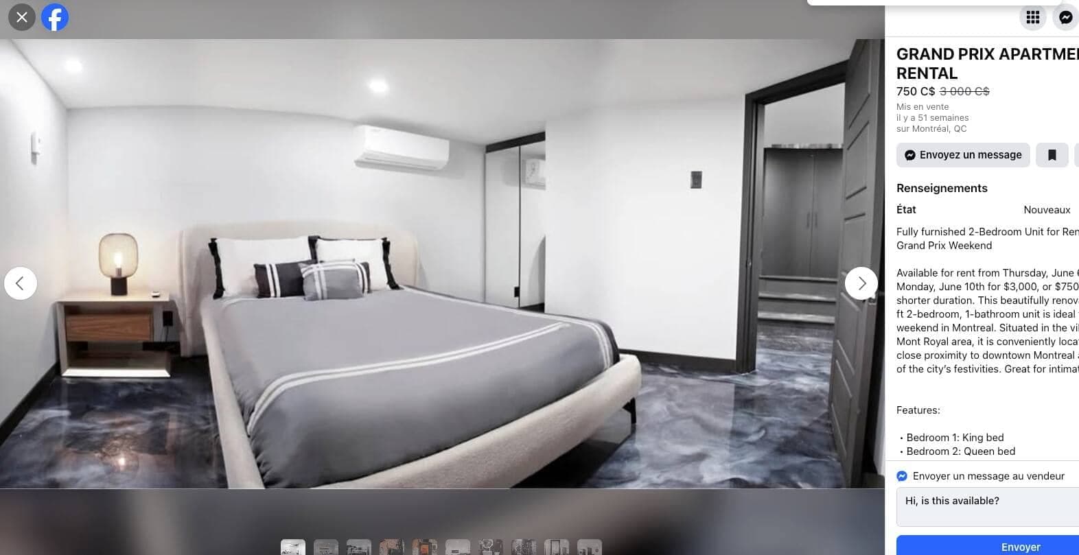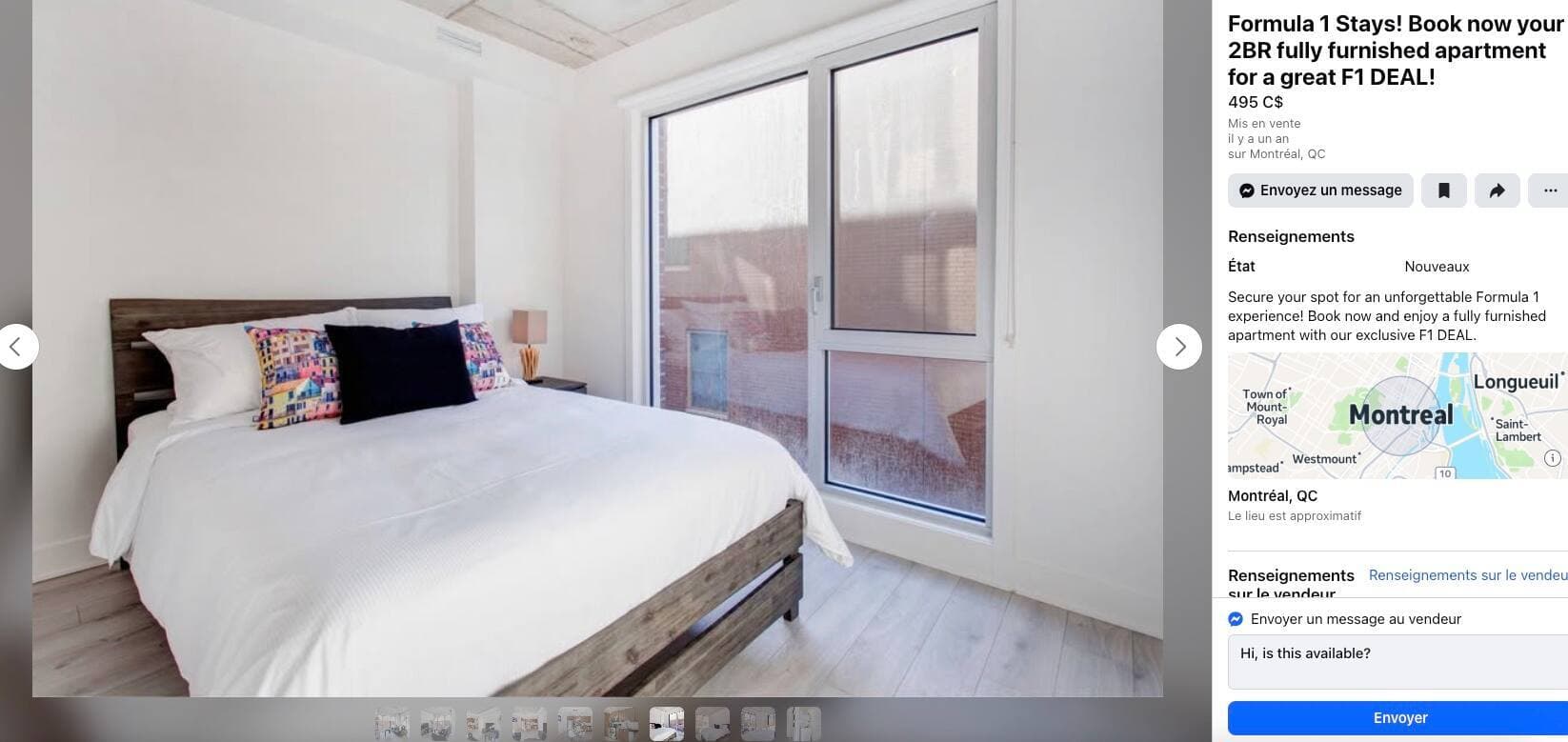 «Envie de vivre le Grand Prix dans un cadre confortable et bien situé? Mon appartement spacieux est disponible pour la fin de semaine de la F1 à Montréal», peut-on lire dans une publication sur Kijiji, où le propriétaire offre un toit dans le quartier Rosemont à 480$ la nuit.