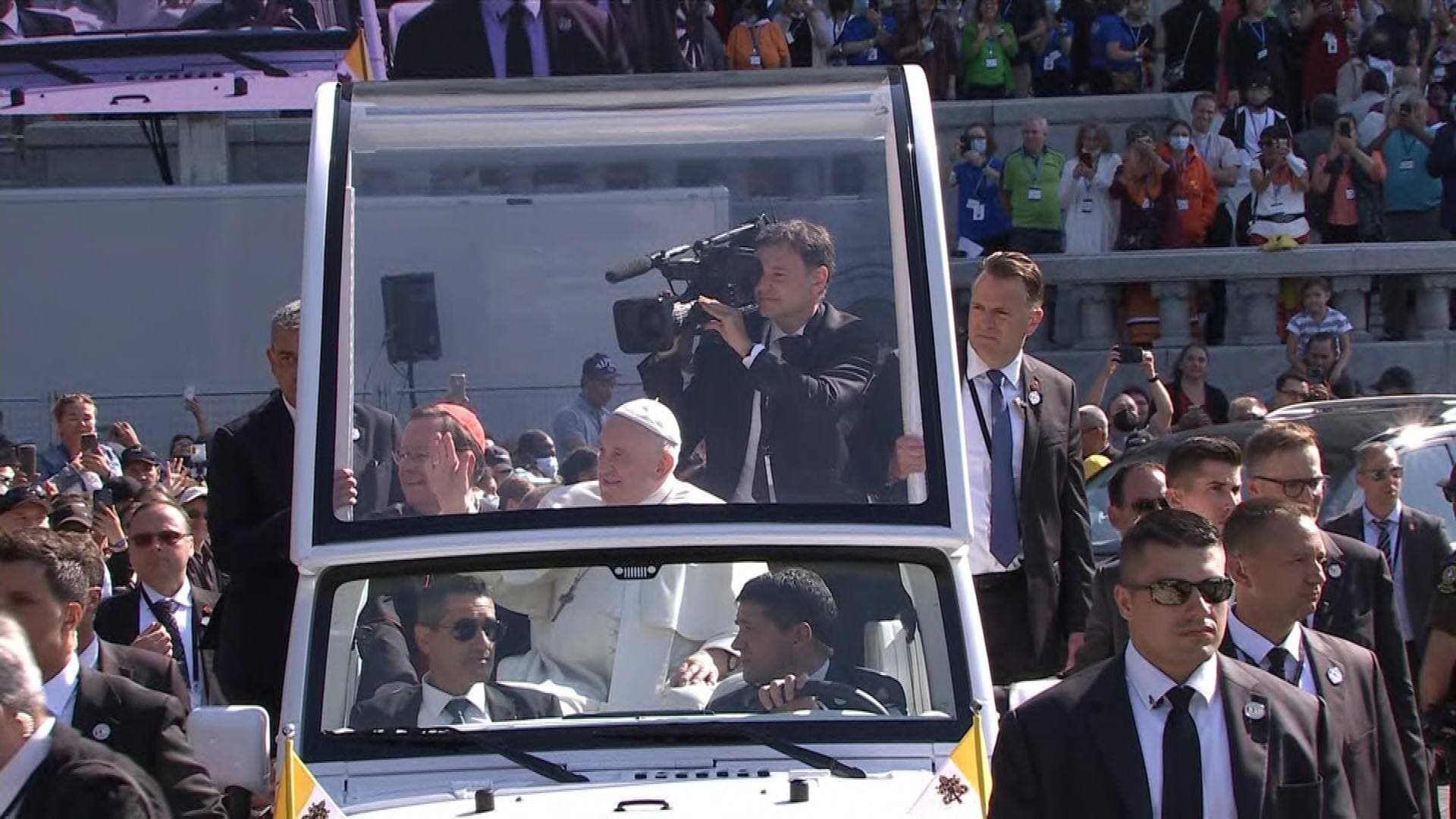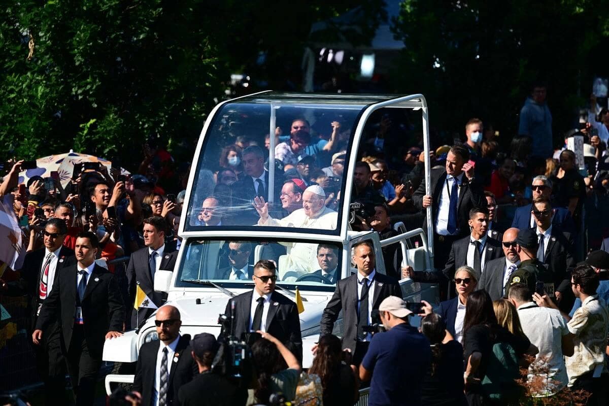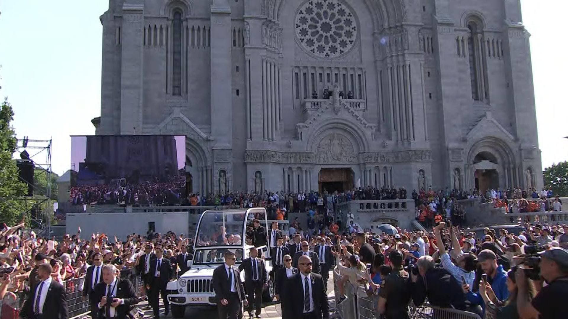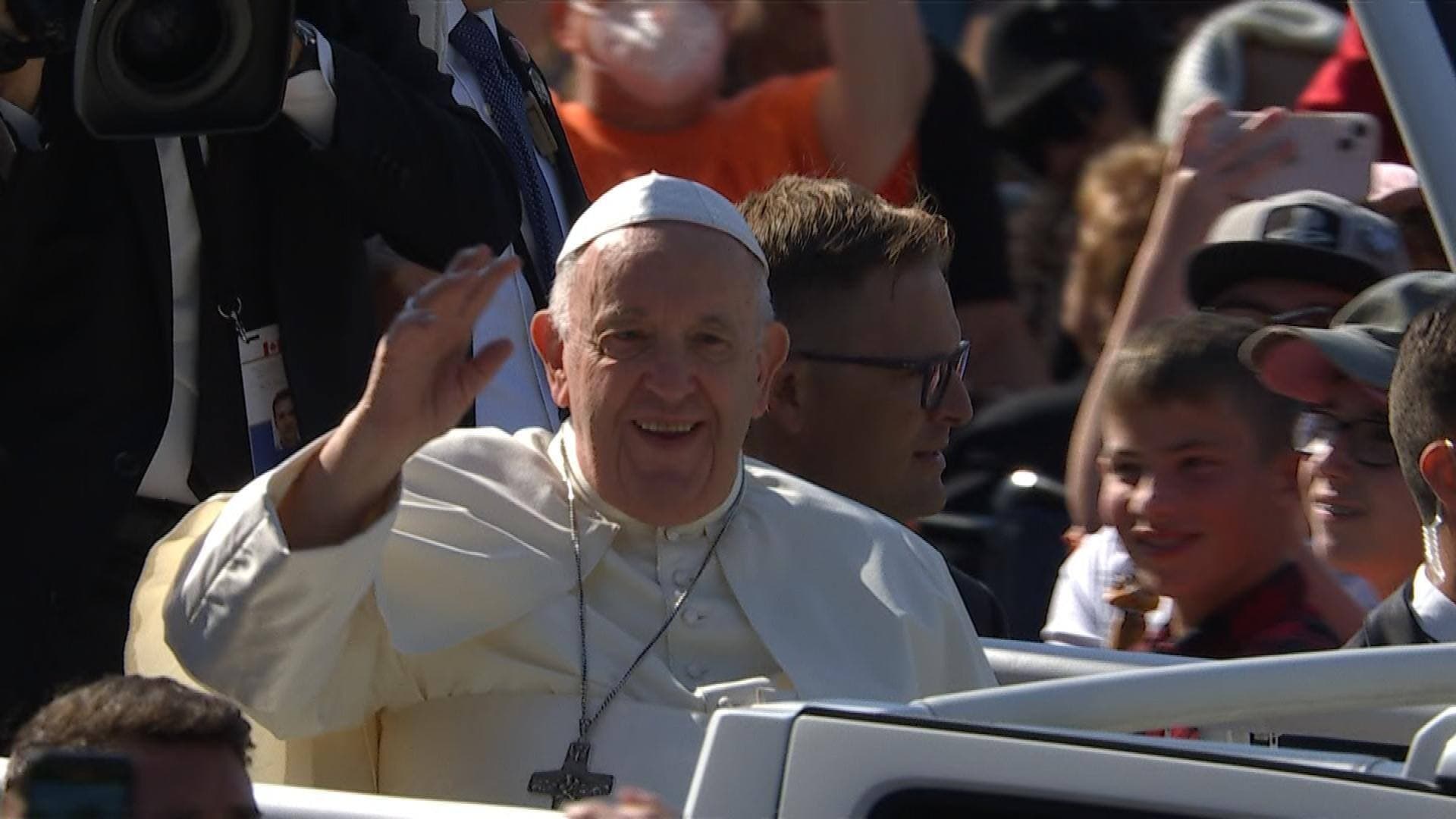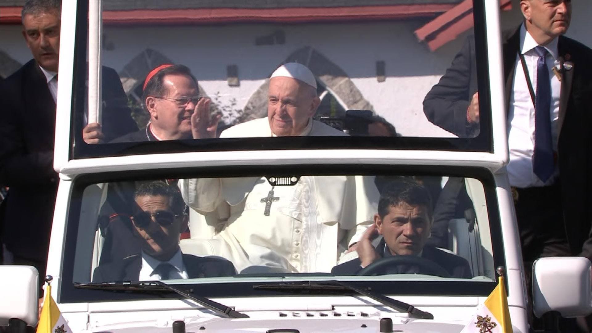 Le souverain pontife est arrivé en papemobile à Sainte-Anne-de-Beaupré en saluant la foule de nouveau principalement constituée de membres des Premières Nations.