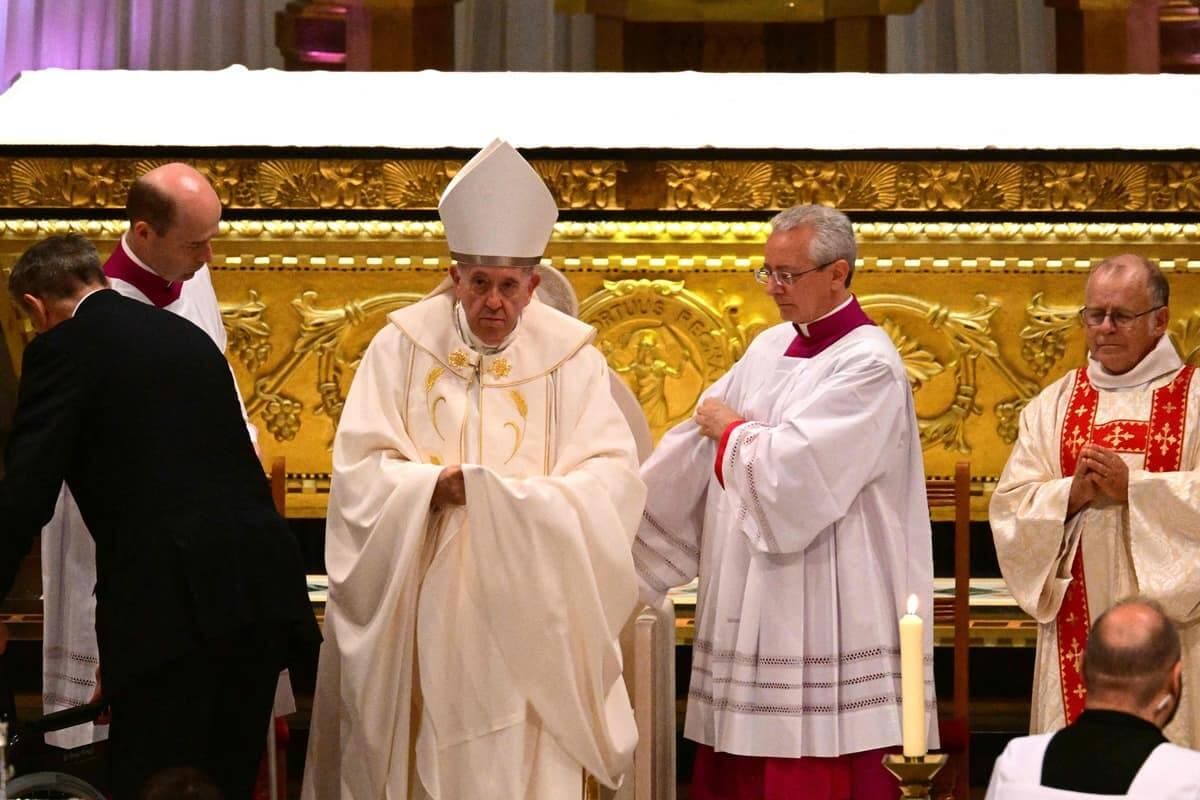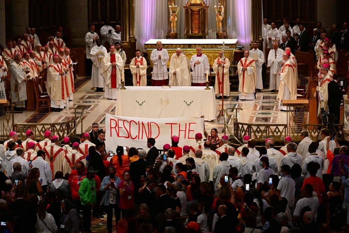 À l'intérieur du sanctuaire, juste devant l'autel et à quelques mètres de François au début de la messe, des manifestants ont déployé une banderole sur laquelle on pouvait lire: «Annulez la doctrine», en référence aux édits papaux du 15e siècle qui autorisaient les puissances européennes à coloniser les terres et les peuples non chrétiens.