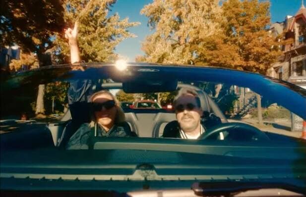 On y retrouve Guy A. Lepage, qui chante au volant d’une voiture, aux côtés de son amie Laurence.