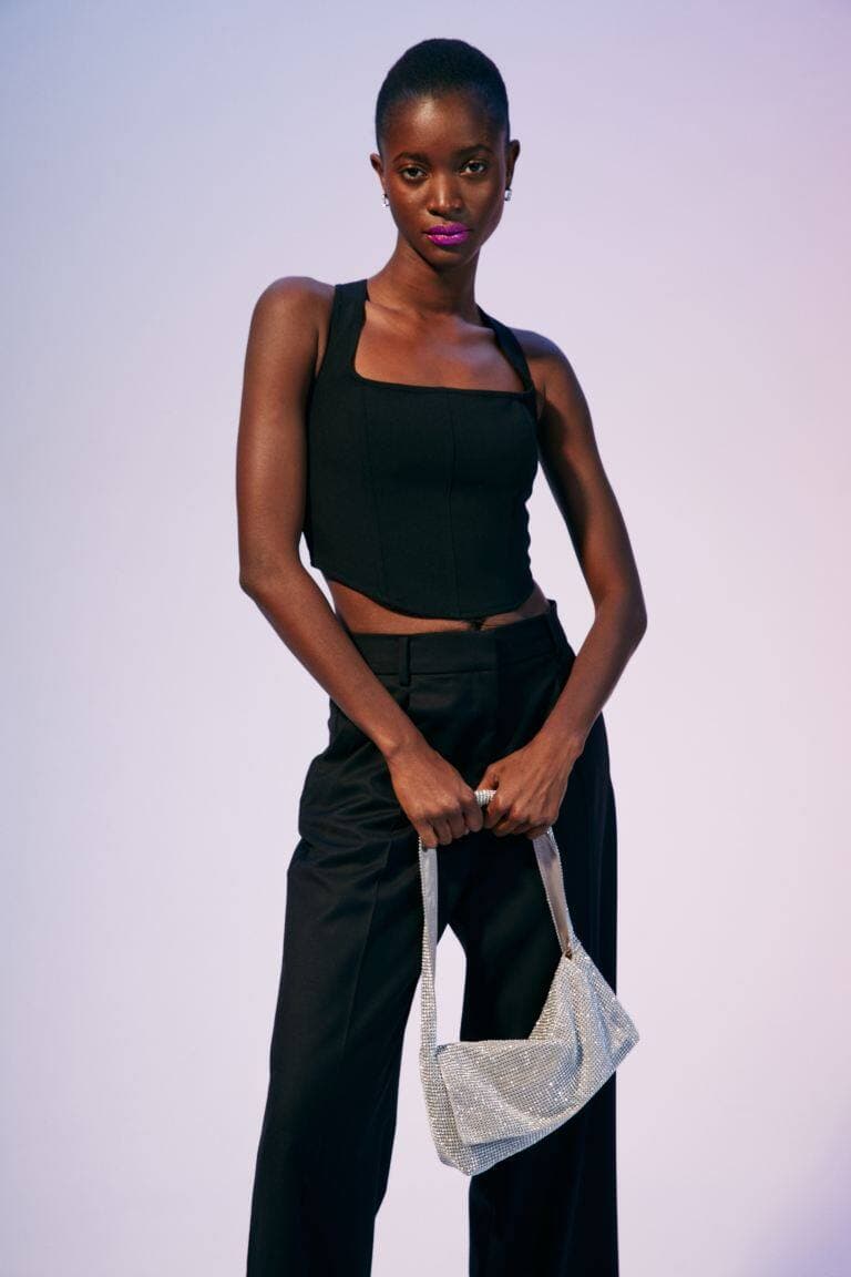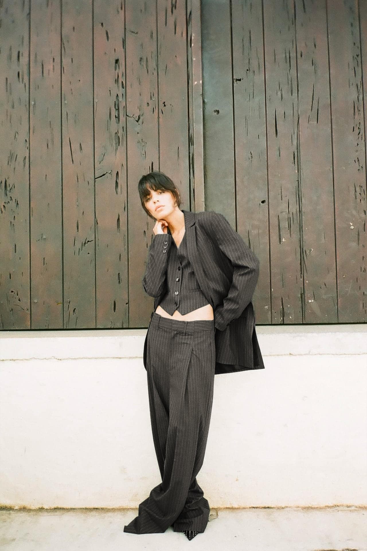 Jenna porte un ensemble de la marque Dion Lee entièrement monochrome qui semble moulée à son corps. L'ensemble est assez modeste étant donné qu'il s'agit tout de même d'un corset, et il pourrait être adapté à nos looks du bureau très facilement! En ajoutant une chemise par exemple, ou en le portant de la même façon que Jenna : avec un pantalon à plis corpo!